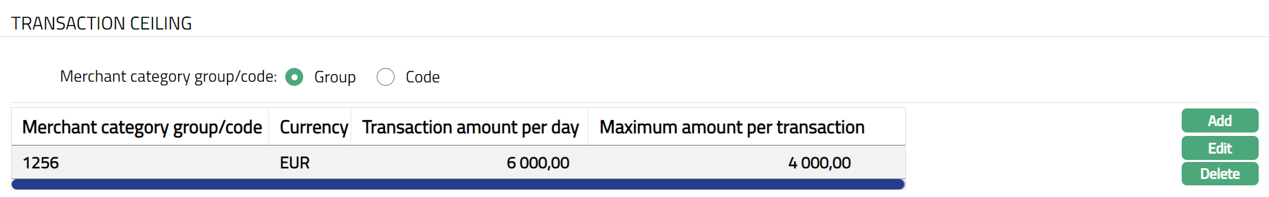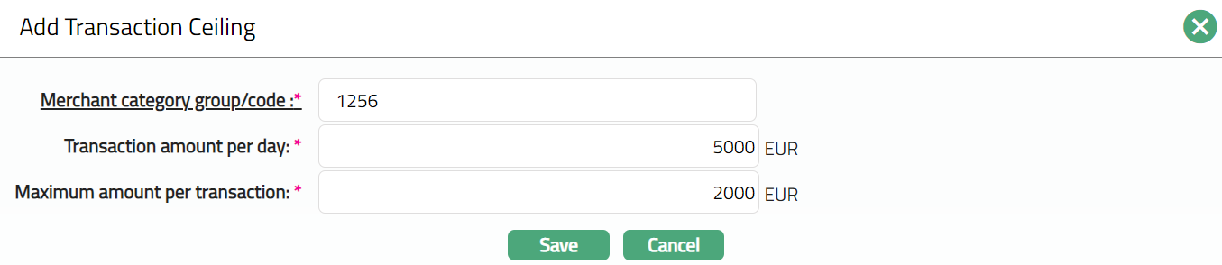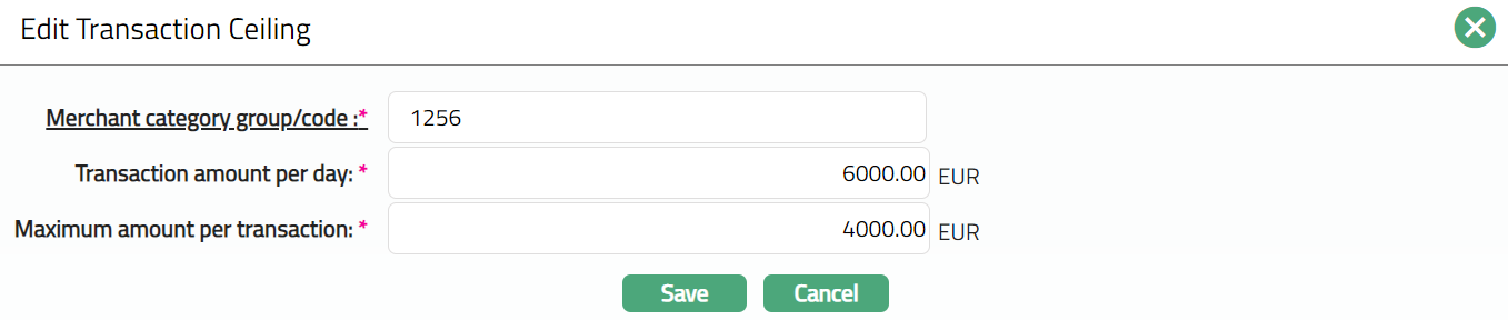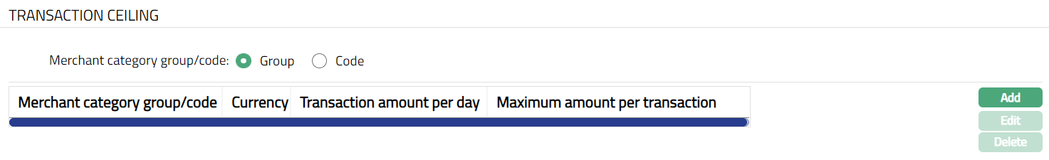 If Code is selected, then you can set the transaction ceiling for an individual merchant. The transaction ceiling set will be applicable only merchants mapping to the selected merchant category group.