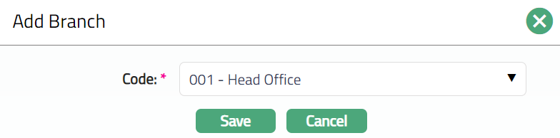 - Click Add. Add Branch window appears where you can select the required branch from the drop-down of all active Branches as maintained under Admin > Branches > Maintain.