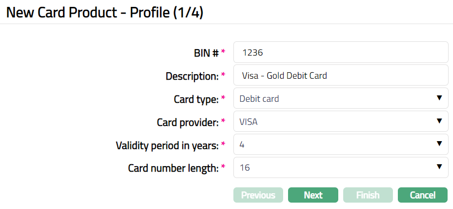 - Click Add. New Card Product -- Profile (1/4) page appears.