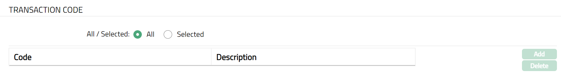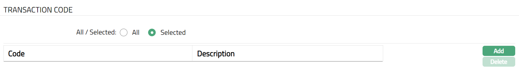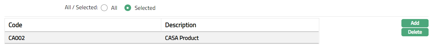 To restrict transaction codes for which this Product is available, click Selected radio button. Add button will be enabled.