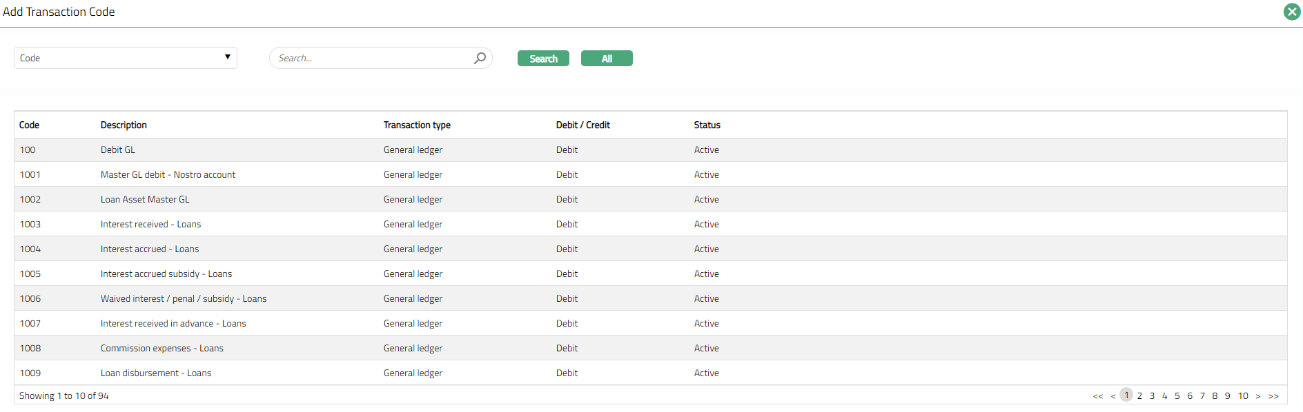 - Click Add. Add Transaction Code page appears showing the transaction codes as maintained under General Ledger > Settings > Transaction code. Search for the required Transaction code with relevant criteria and select the required Transaction code.