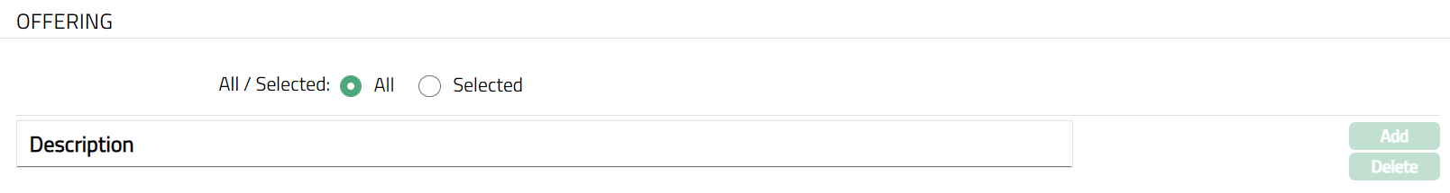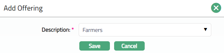 - Click Add. Add Offering window appears where you can select the required Offering from the available drop-down list of active Offerings as maintained under Admin > Pricing> Categories > Offering.