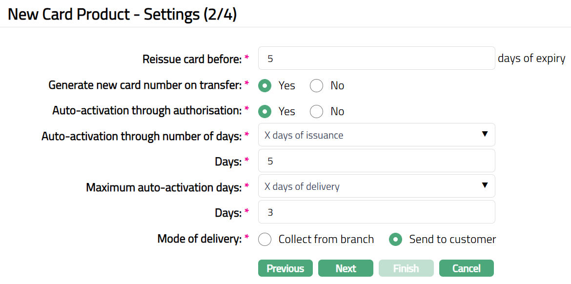 X days of delivery - If this option is selected, then the bank will wait for x days after the card is delivered. The client has to do the first transaction within the X days and the card is activated. Else the card is de-activated.