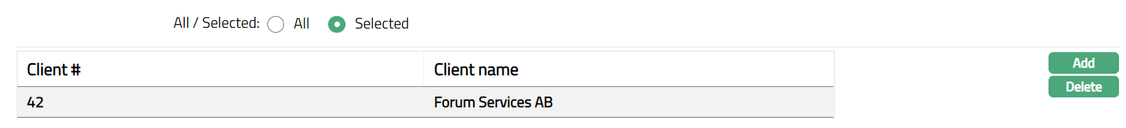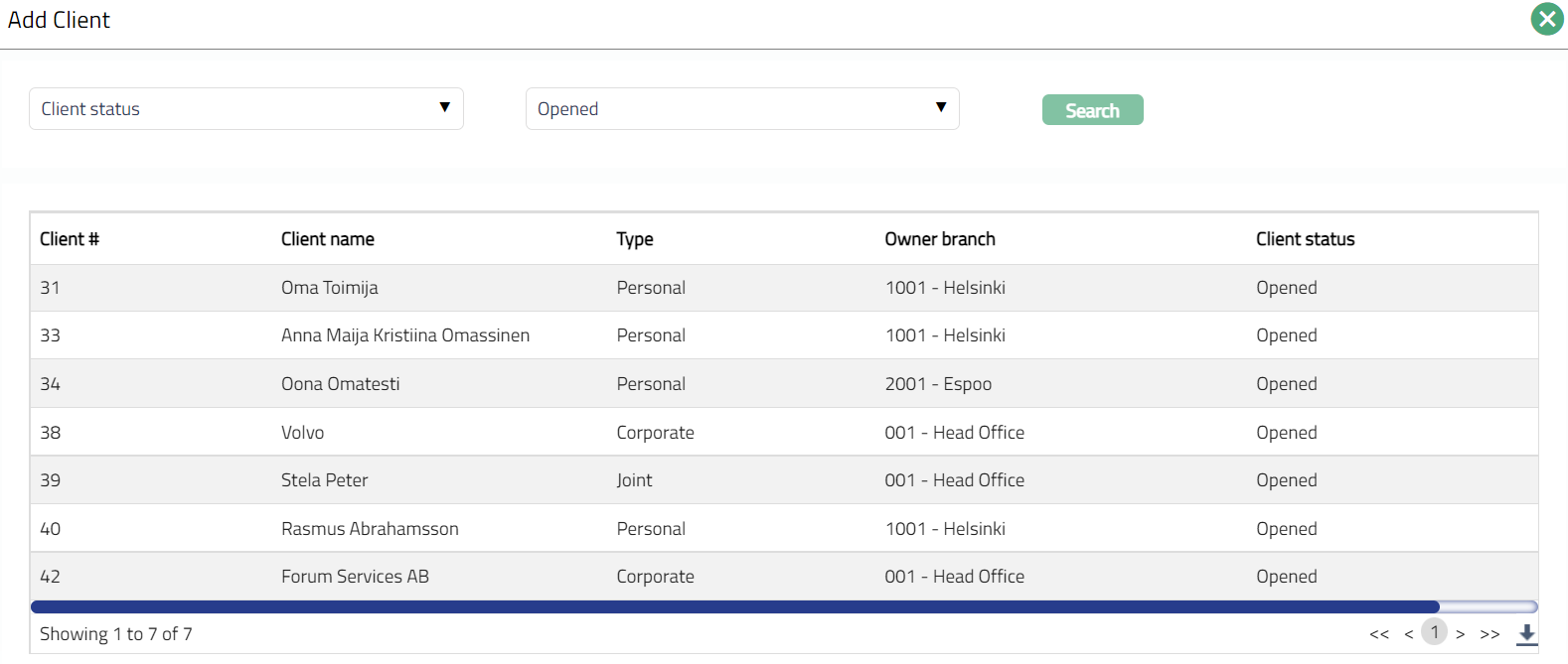 - Click Add. Add client page appears, showing the clients as maintained under CRM > Clients > Maintain. Search for the required client with relevant criteria and select the required Client.