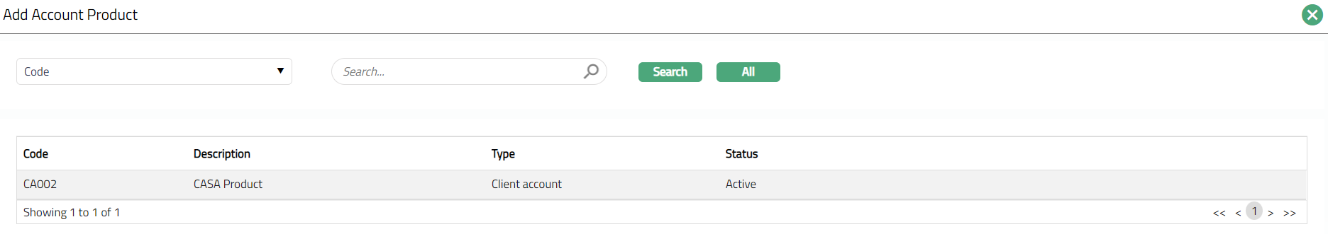 - Click Add. Add Account Product window appears, showing the list of Current account products as maintained under Retail > Settings > Product. In case of Credit Card products, this list shows only those Current account products where the Overdraft is allowed. Search for the required Account Product with relevant criteria and select the required Account Product.