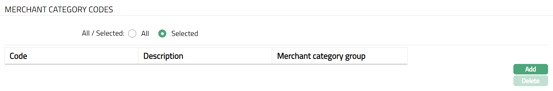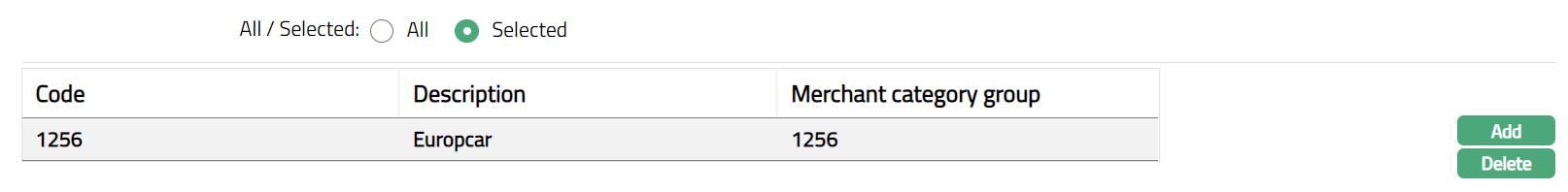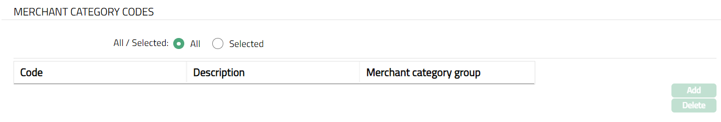 To restrict Merchant code for which this Card Product is available, click Selected radio button. Add button will be enabled.