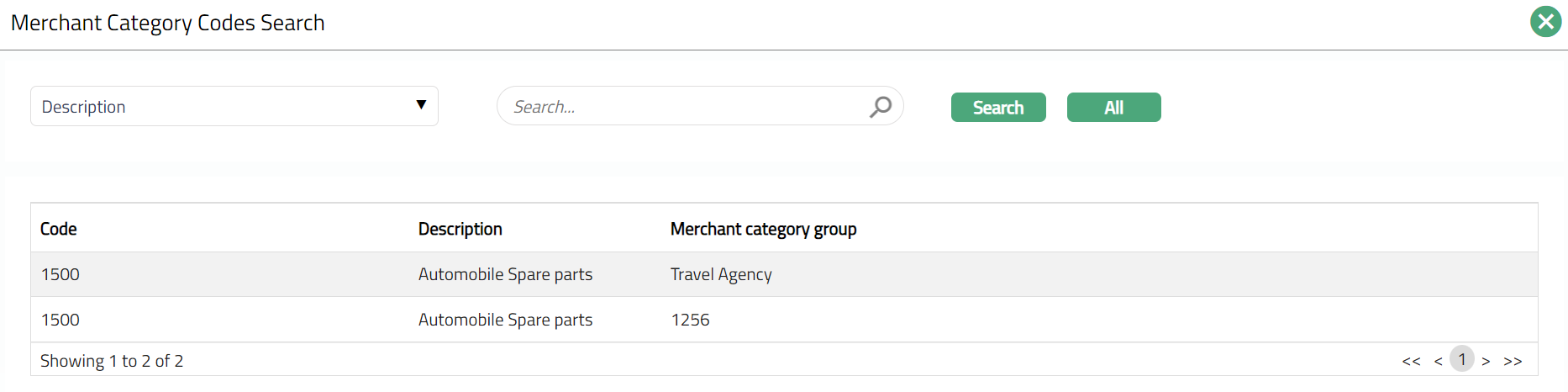 Click Merchant category group / code hyperlink. If Group is selected as an option, then list of merchant category groups are displayed on the Merchant Category Search page. If Code is selected as an option, then list of individual merchants with the codes are displayed on the Merchant Category Code Search page.