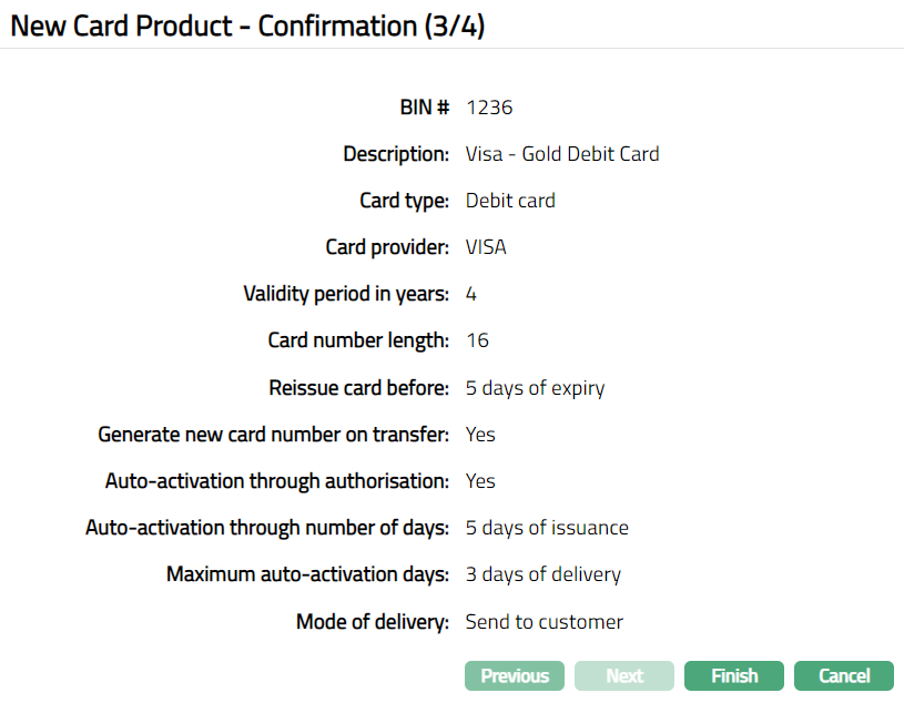Click Next. New Card Product -- Confirmation (3/4) page appears.
