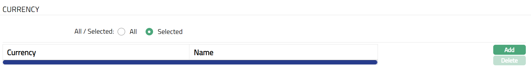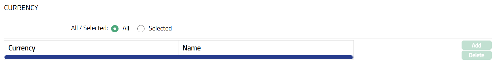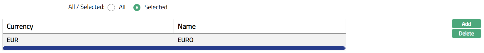 The Currency tab allows you to maintain the currency for the Card Product. Cards under the Product can be issued only in these currencies.