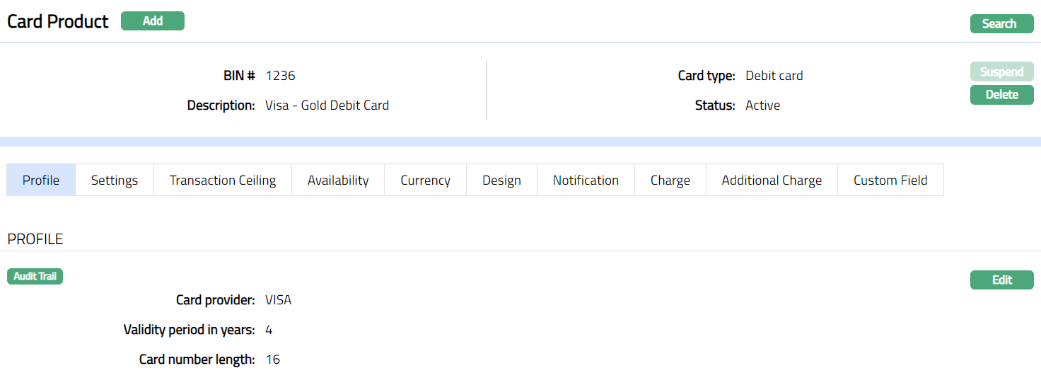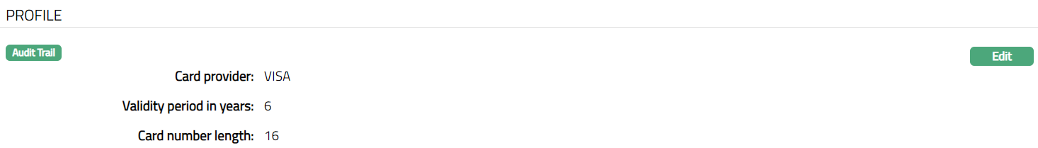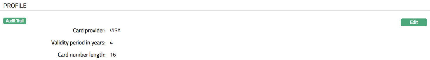 - Access Card Product page. Click Profile tab to view the details as per sample below. The details are defaulted from the entries that you made during Card Product creation. For details refer to New Product -- Profile (1/4).