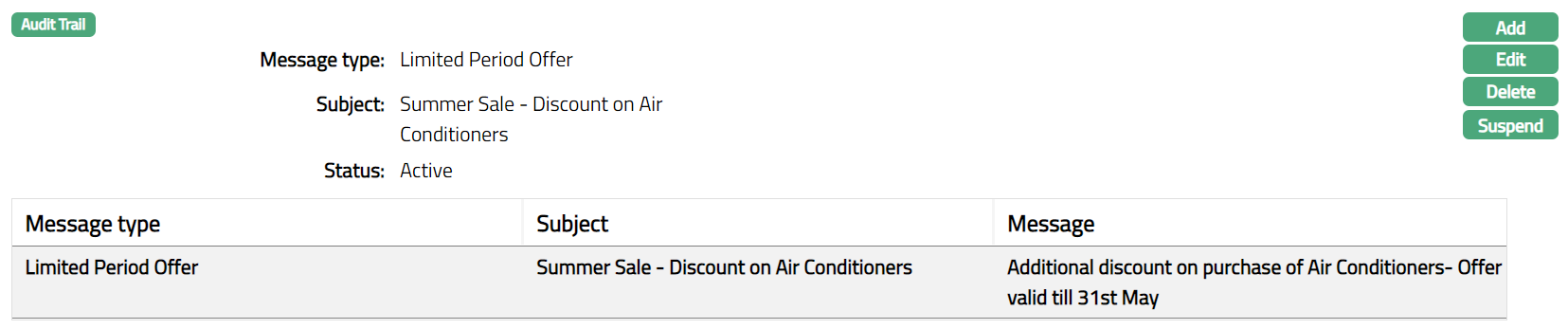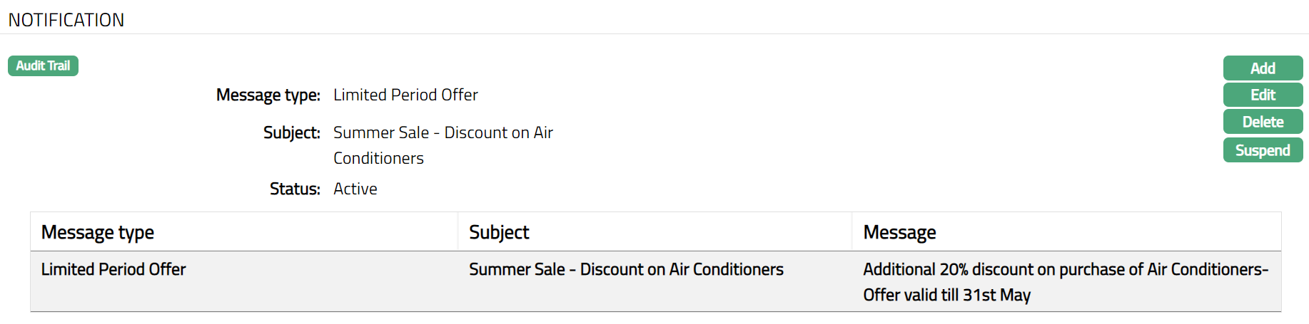 Delete: You can delete a Notification by a click on Delete button. When you click Delete button, Aura displays an alert message. On confirmation Aura will delete the Notification.