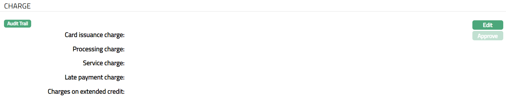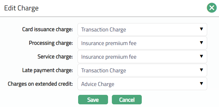 Charge tab allows you to maintain, view and edit the details of different charges for cards under the Card Product.
