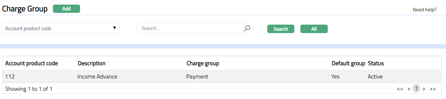 From Card menu, click Settings, and then Charge Group. Charge Group Search page appears. All existing Charge groups appear on the page.