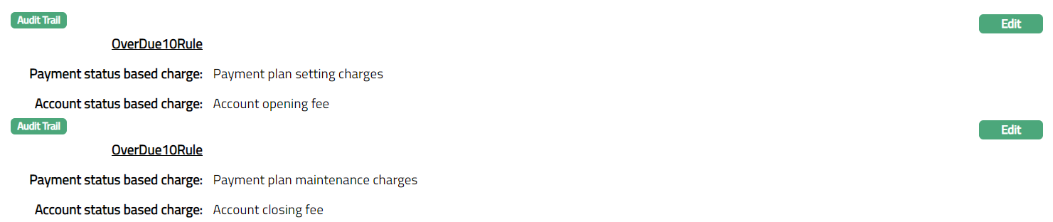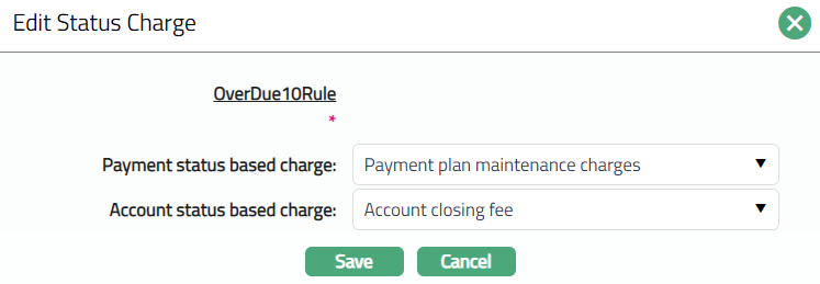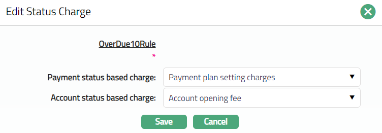 Select Payment overdue fee for the Charge Group from the drop-down list of all the active Charge schemes maintained under Admin > System Codes > Charges > Charges. This charge will be levied if the customer misses payment of amount required and if the payment status is Normal and the charge is selected from the list of Event based Flat charges.