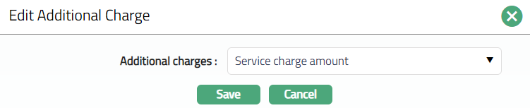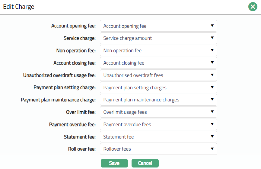 Select Account Closing fee for the Charge Group from the drop-down list of all the active Charge schemes maintained under Admin > System Codes > Charges > Charges. It is used for closure of the account and is selected from the list of Event based Flat charges.