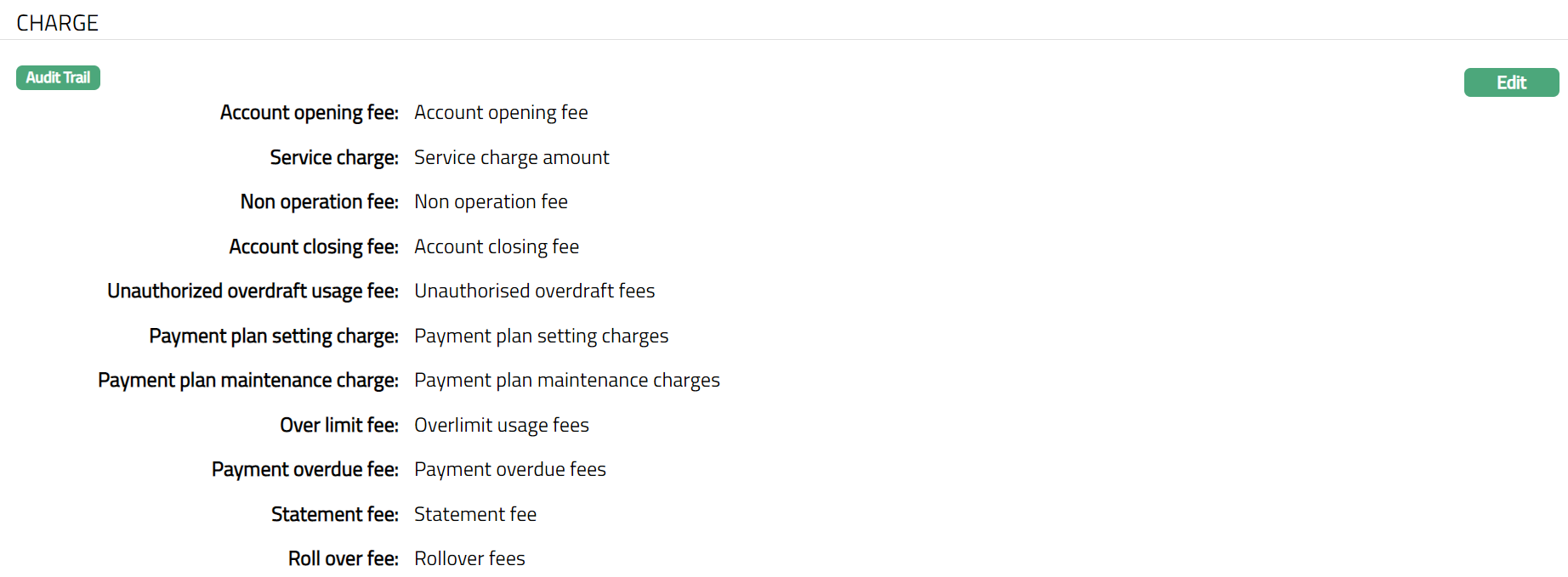 Select Unauthorized overdraft usage fee for the Charge Group from the drop-down list of all the active Charge schemes maintained under Admin > System Codes > Charges > Charges. This charge is levied every time the account goes beyond its authorized limit and is selected from the list of Event based Flat charges