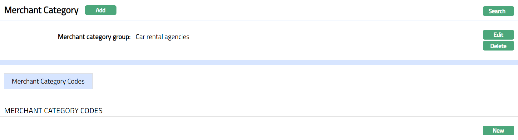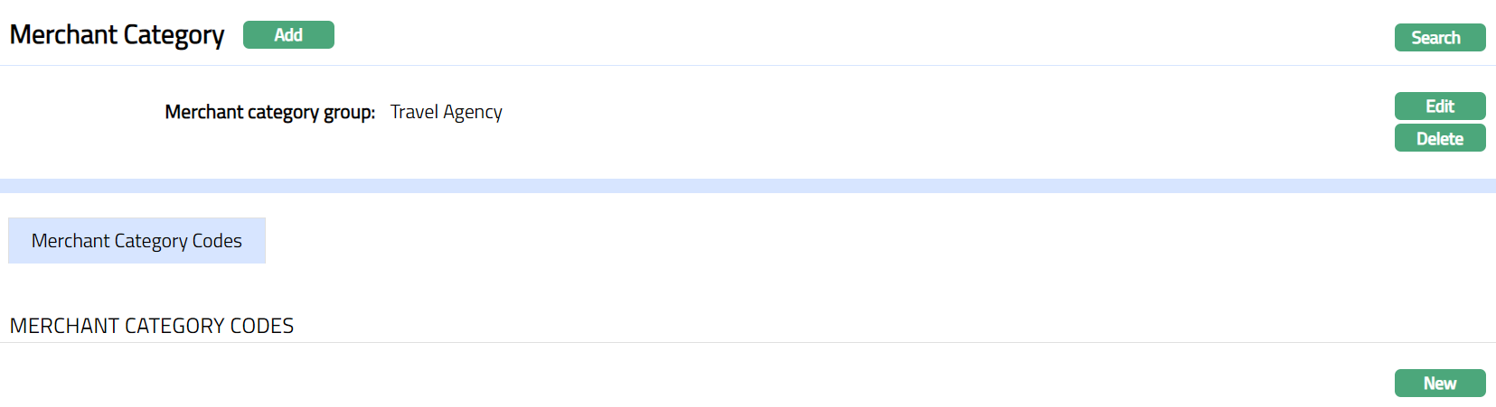 From Menu click Card, then click Settings and then Merchant category. Merchant Category Search page appears.