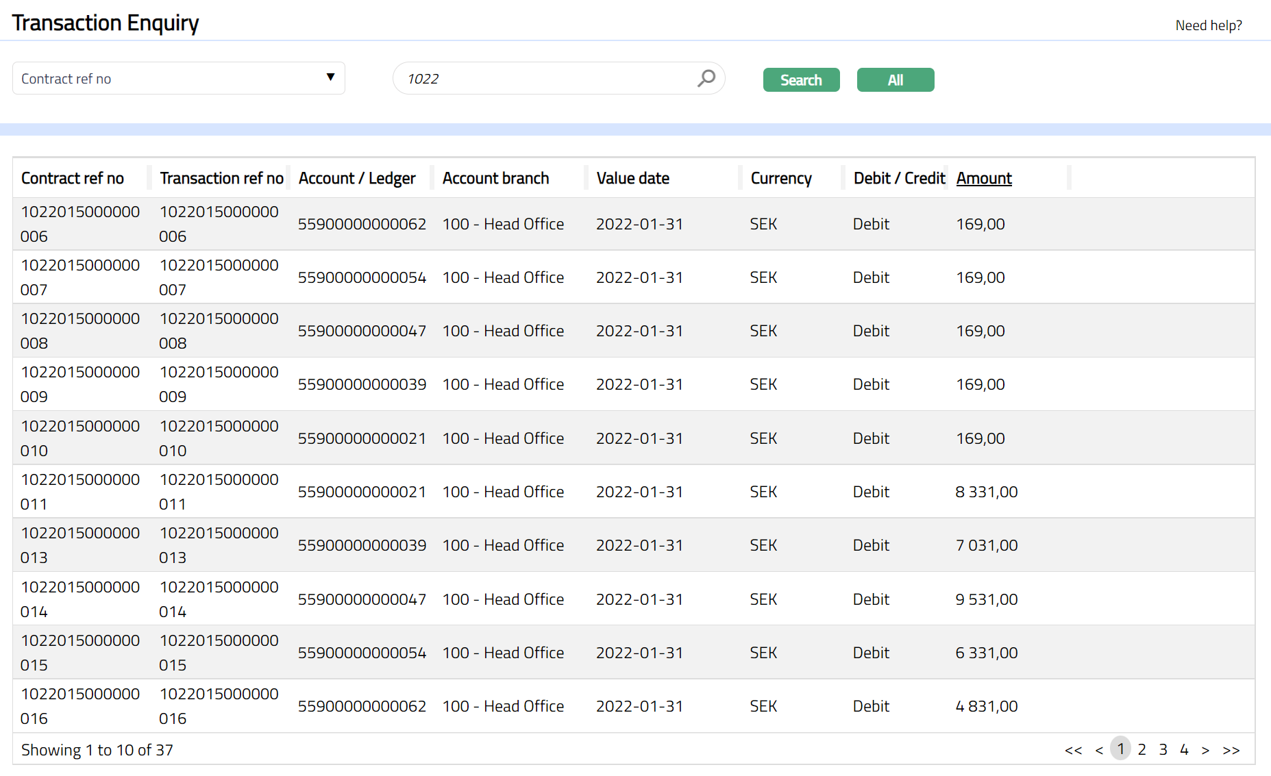 Choose an appropriate search input in the Search for drop-down and input the required value for the condition. You can search based on the following inputs: Account/ledger, Booking date, Contract reference number, Currency, Debit/Credit, Transaction code, Transaction reference number and Value date. For example, select Contract ref no from the Search for dropdown and enter 00183198486 in the search text box. Click Search. All successful transactions available in Aura which satisfy the search condition will appear on the page, as shown below.