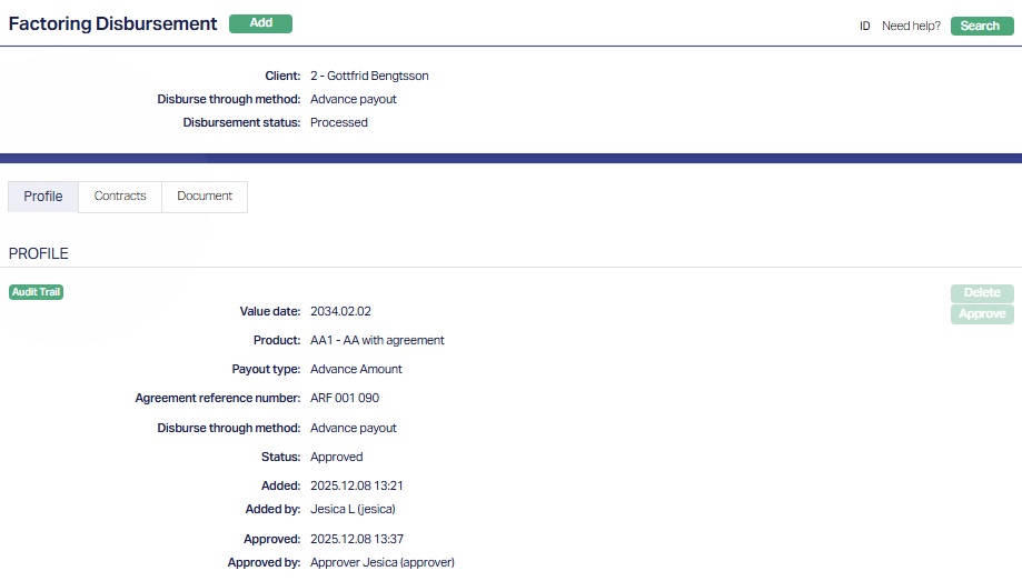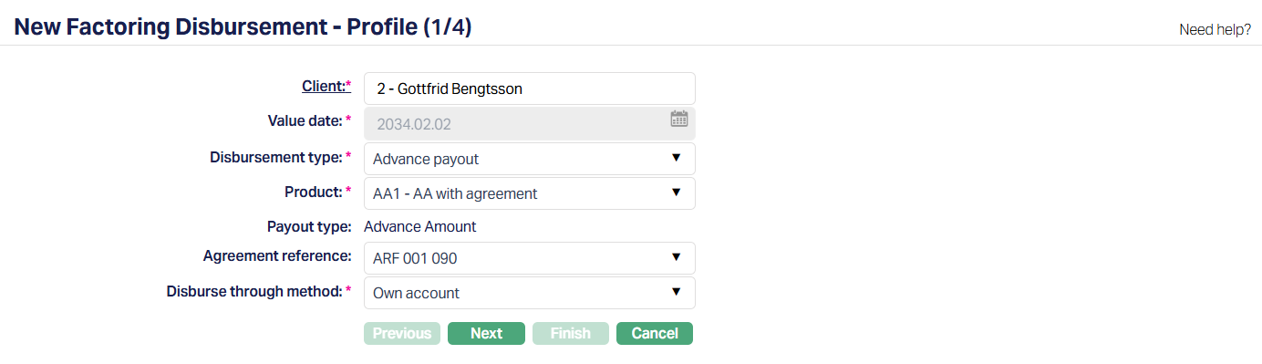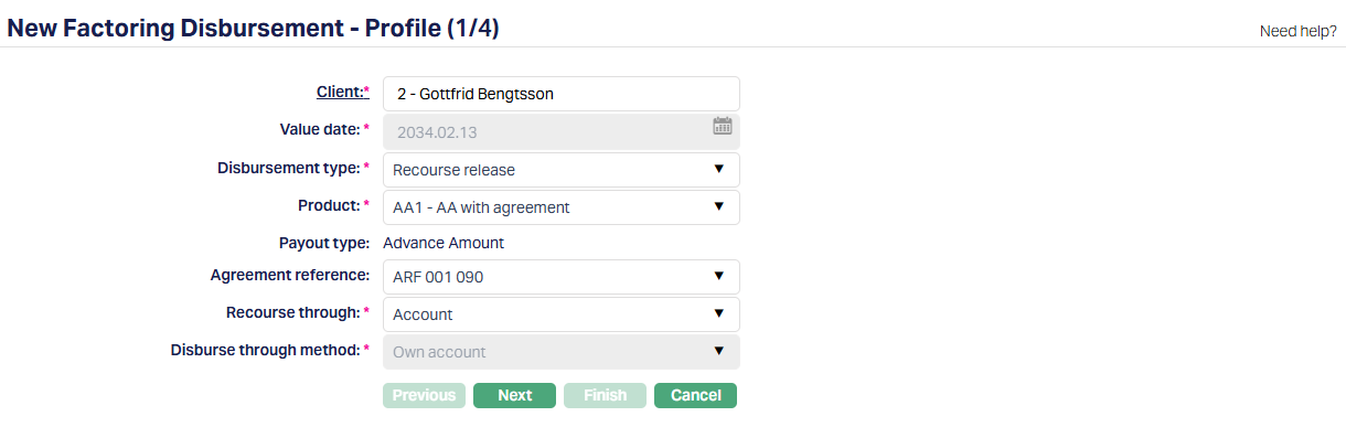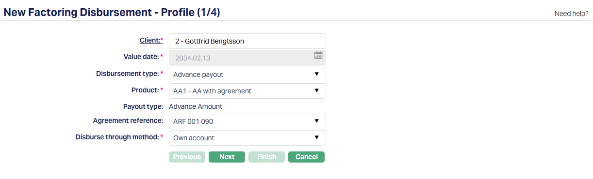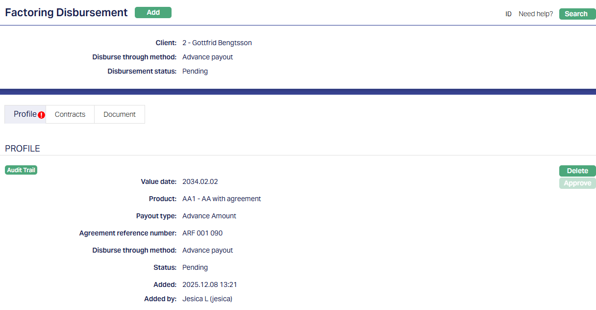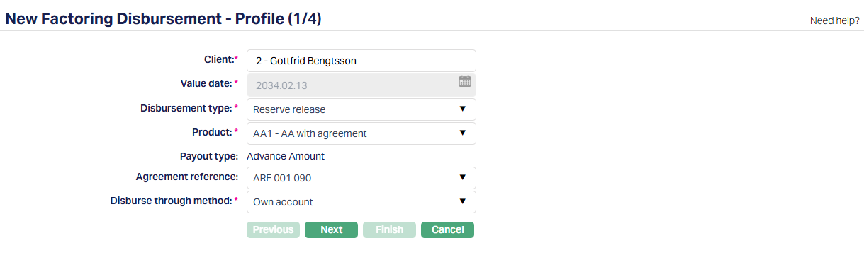 2. Click Add. New Factoring Disbursement → Profile (1/4) page appears.