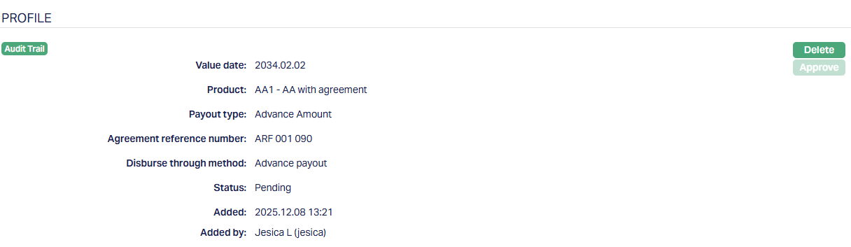 Delete: The delete button is enabled only when the disbursement is in Pending status. After the record is approved and the Disbursement status becomes Processed, the button is disabled.