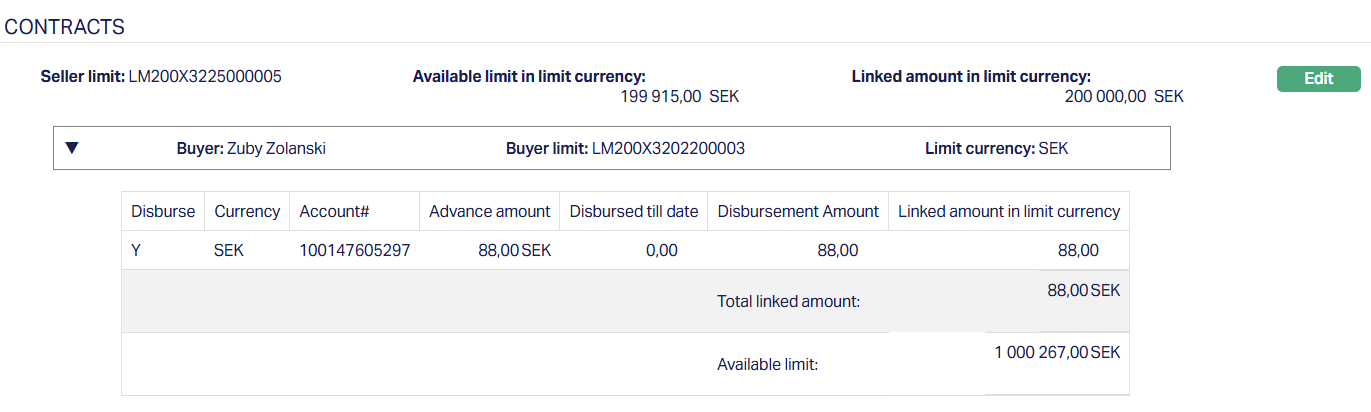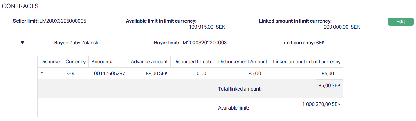 a) Advance Payout - Advance Amount: For Advance Amount disbursements, the Contracts tab displays the full limit structure because the disbursement affects both the Seller Limit and the Buyer Limit.