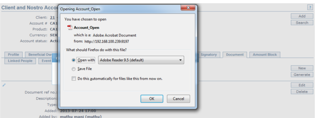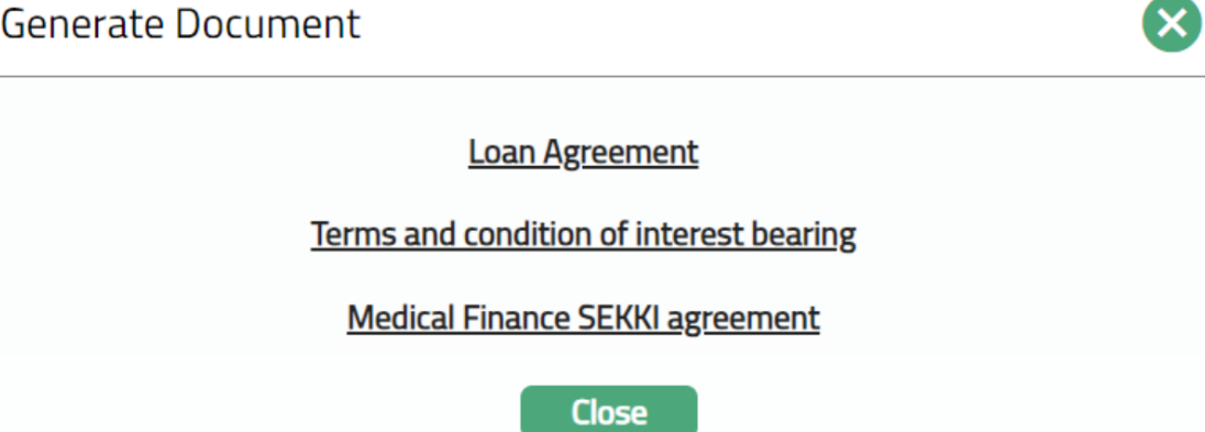1. Click Generate to generate the .pdf file using the template as maintained under Admin > System Codes > Documents > Document templates. You have to map the document template for Contract Disbursement using the Document Template Settings tab as maintained under Retail > Settings > Product. Generate Document page will appear where the mapped templates will be displayed.