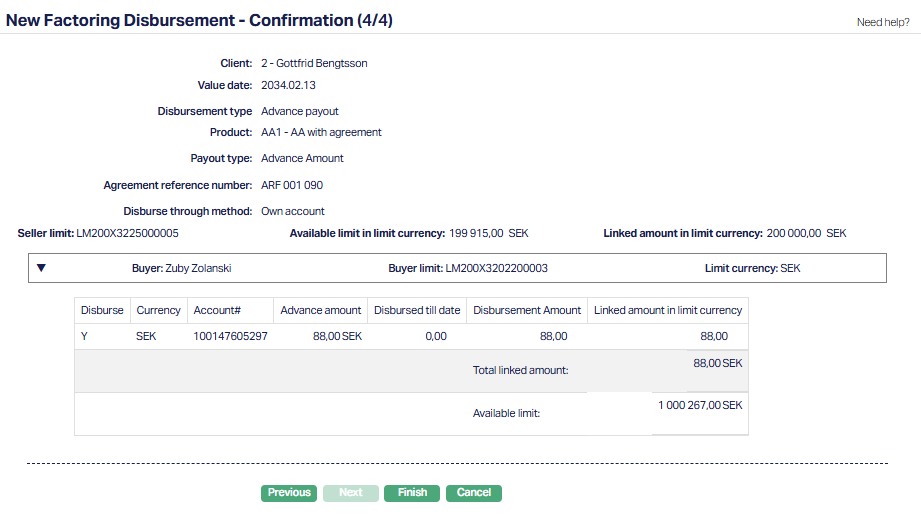 15. Click Next. New Factoring Disbursement → Confirmation (4/4) page appears.