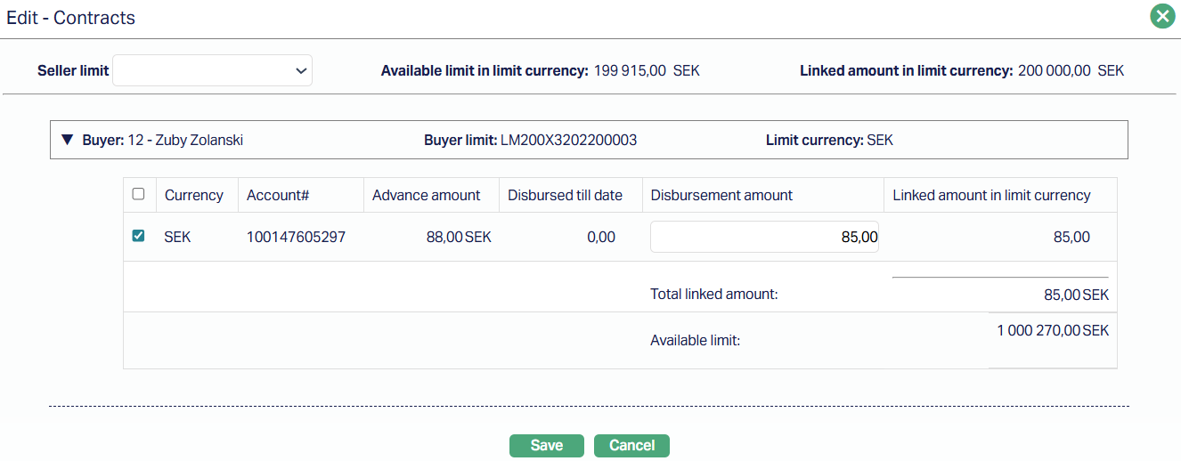 If both limits are sufficient, Aura displays the equivalent amount under Linked Amount in Limit Currency and adds it to the Buyer's Total Linked Amount for this disbursement.