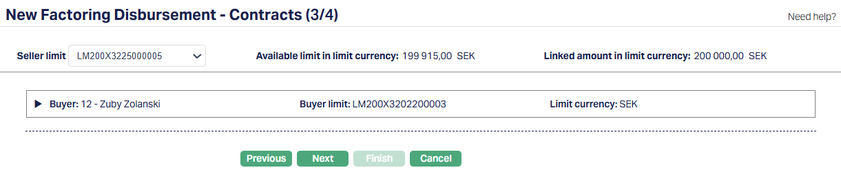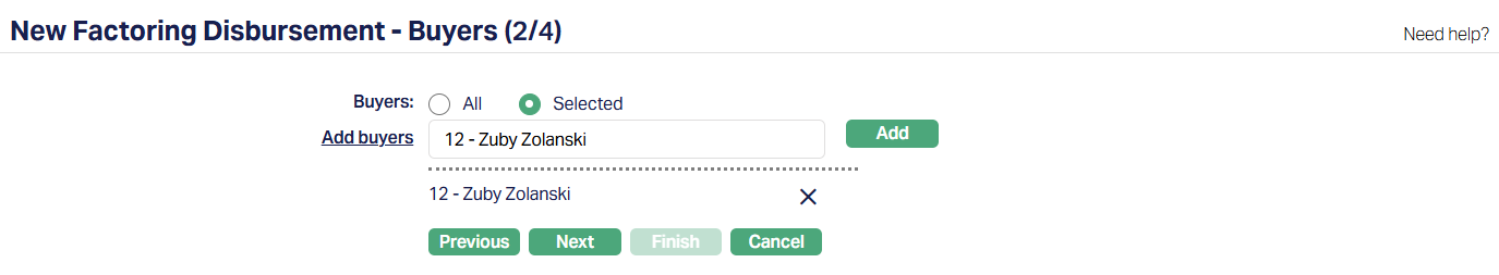 11. Click Next. New Factoring Disbursement → Buyers (2/4) page appears.
