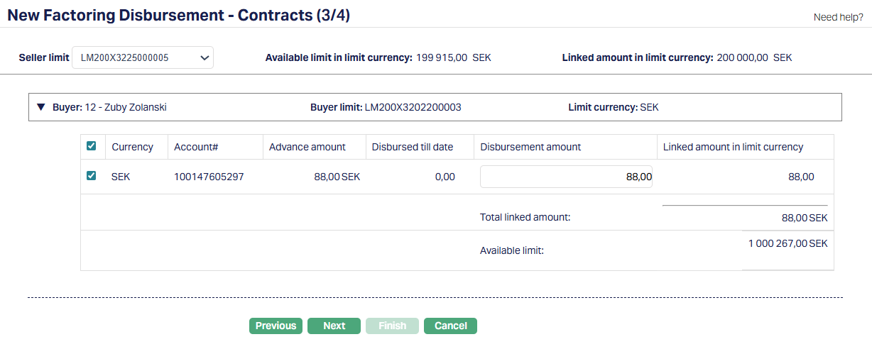 14. Click Next. New Factoring Disbursement → Contracts (3/4) page appears.