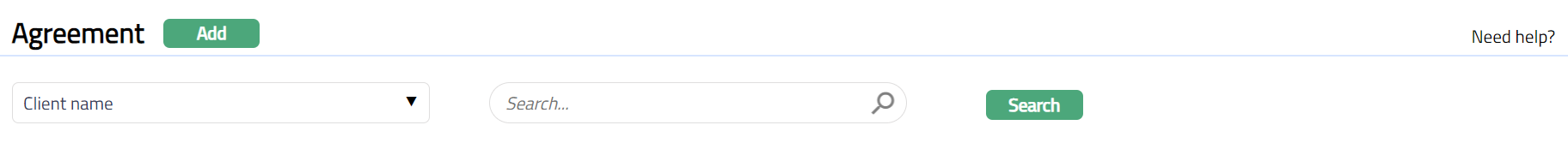 Access CRM menu, click Clients and then Agreement. The Agreement Search page appears.