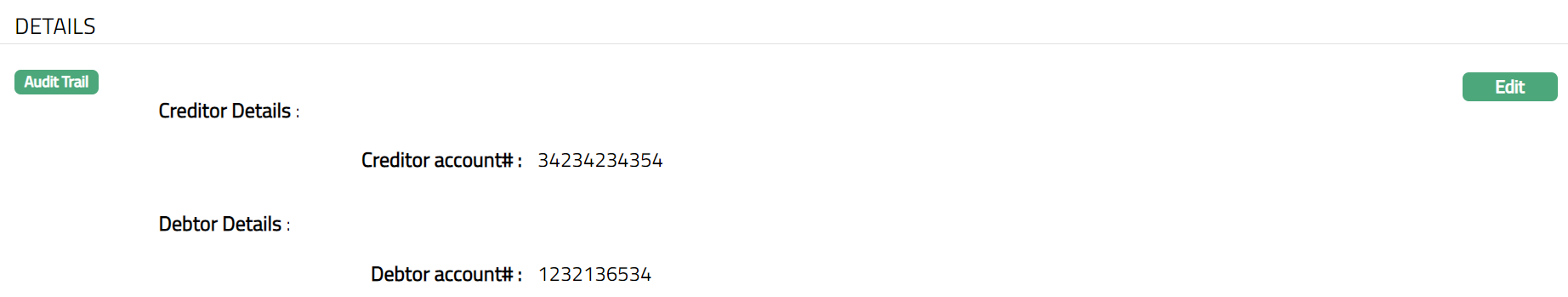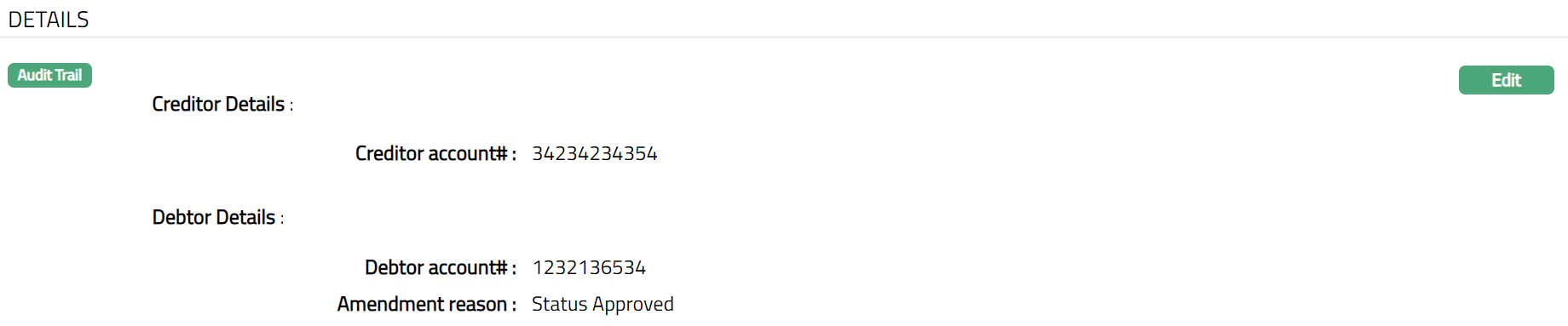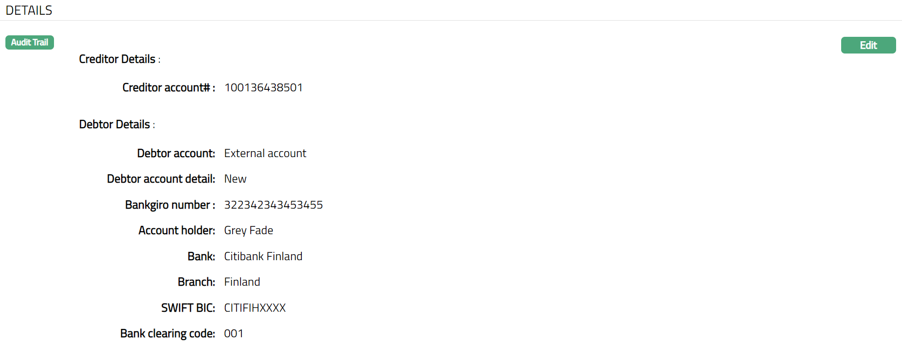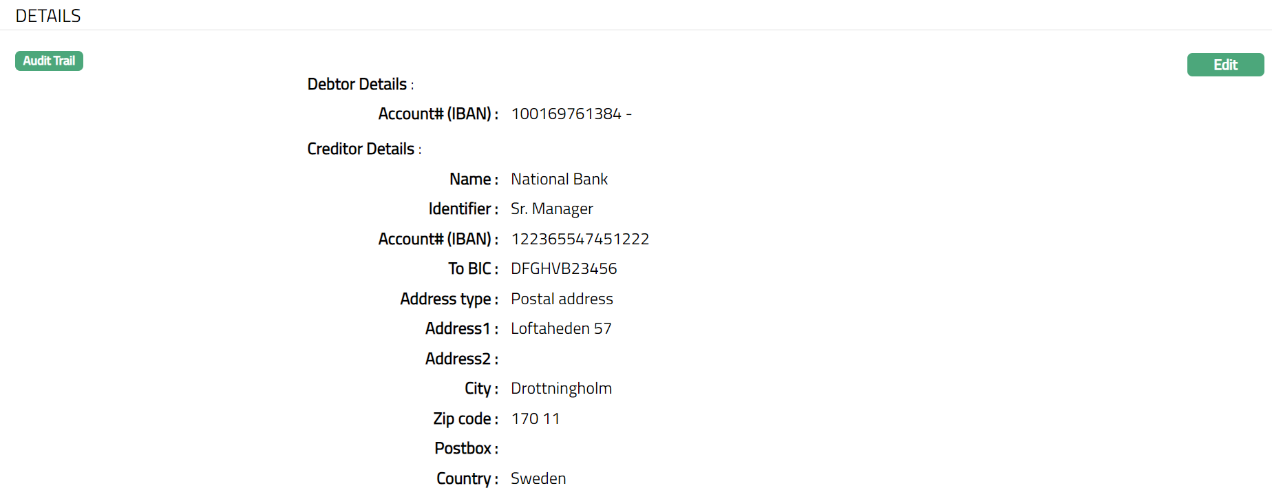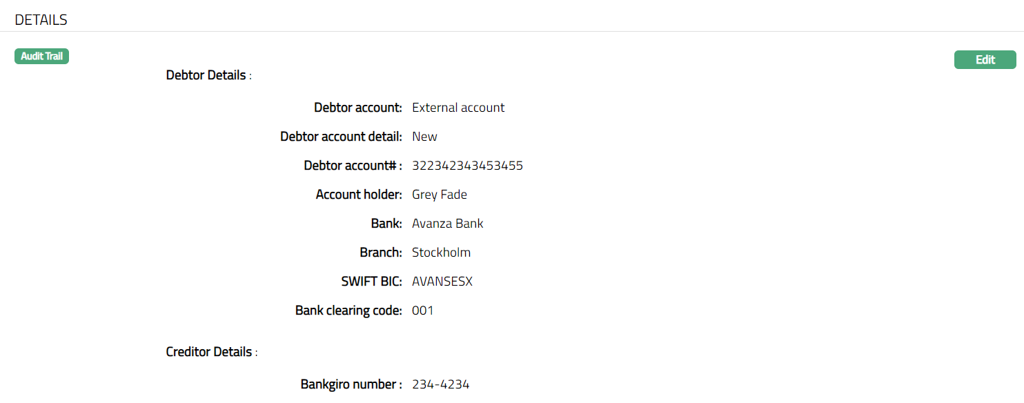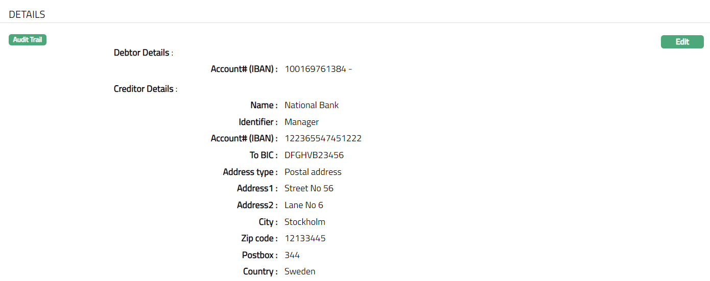 The creditor and debtor details entered in the Agreement for SEPA > Agreement -- Details (2/3) are displayed under the Details tab.