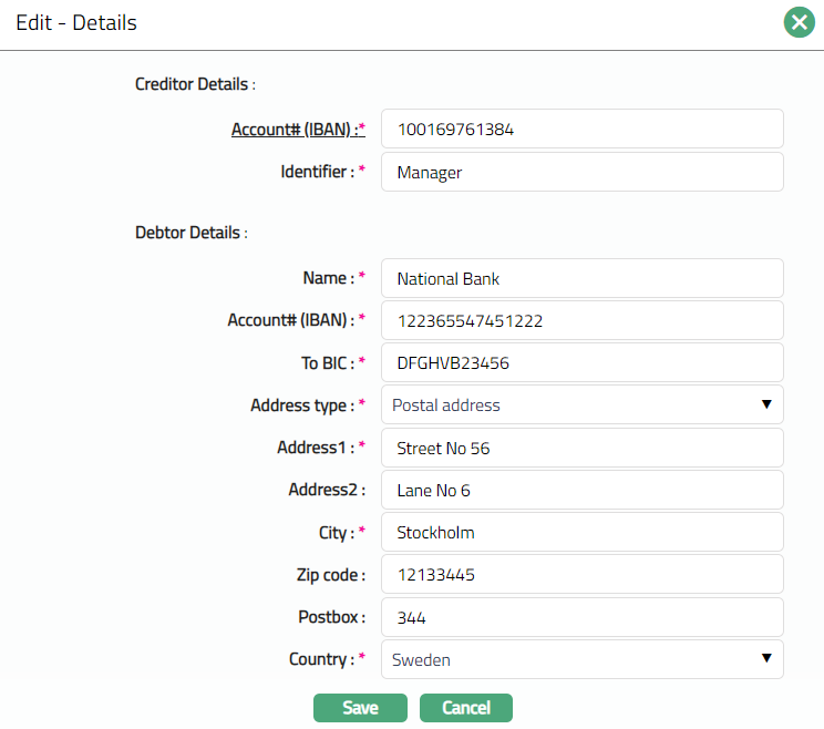 ii. Enter Identifier of creditor. Ex- CCNNZZZX, where CC is ISO Country code, NN is check digit, ZZZ is Creditor business code and X is Country specific details used to identify the Creditor without ambiguity.