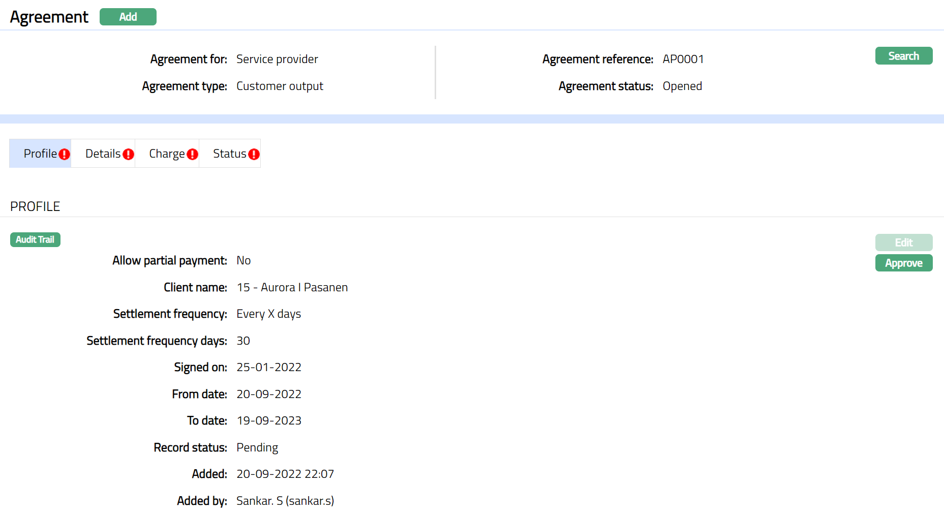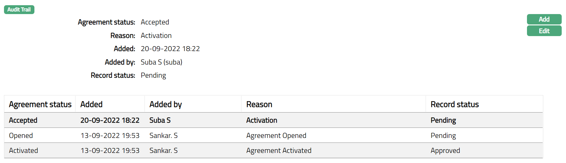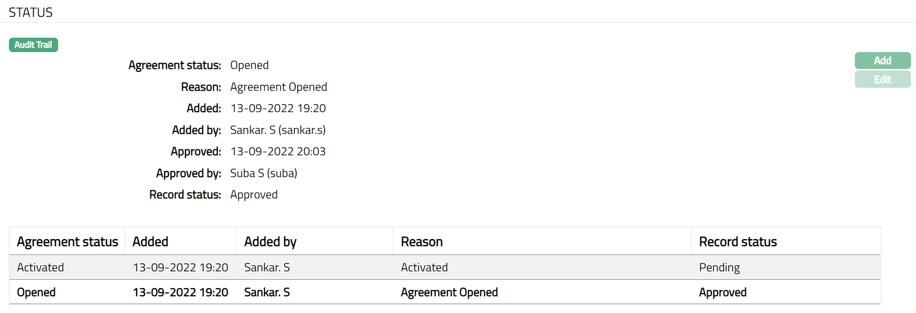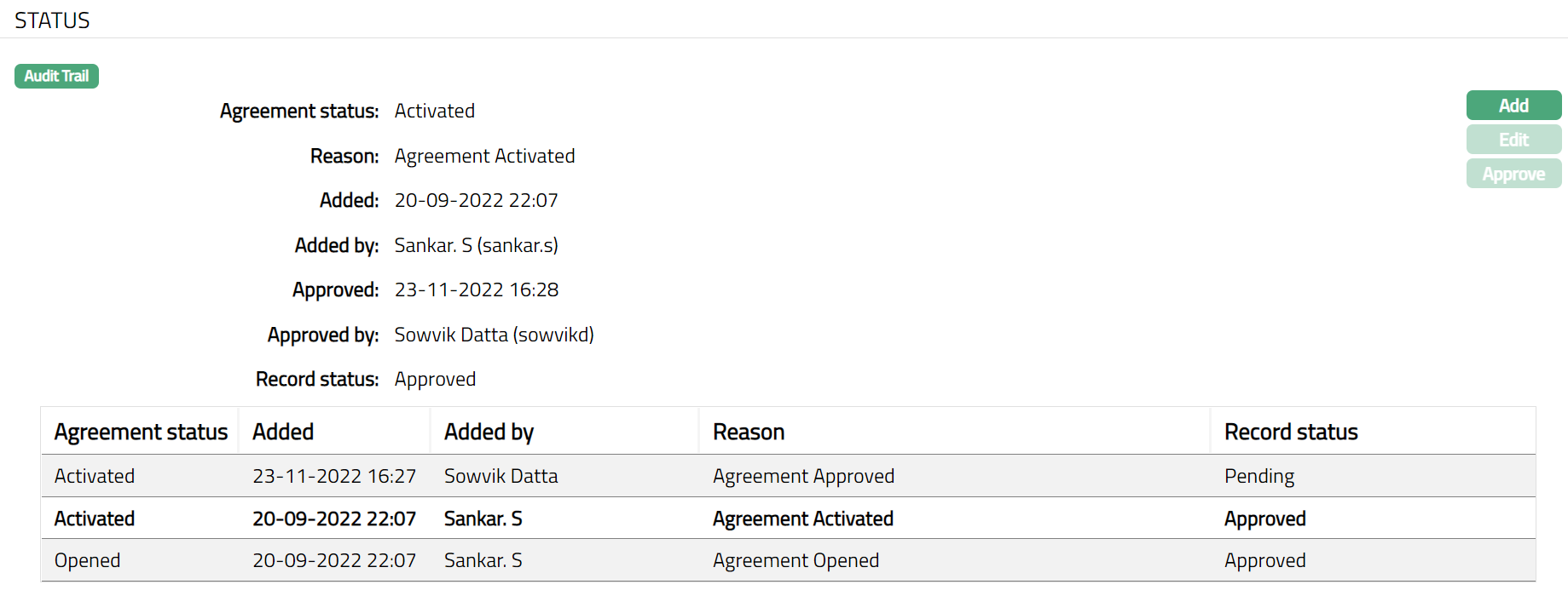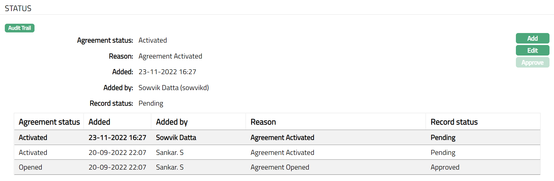 Note: On edit / adding a new agreement status, the Record status will be Pending. Any user other than the one who has edited / added the Agreement Status can Approve the Status