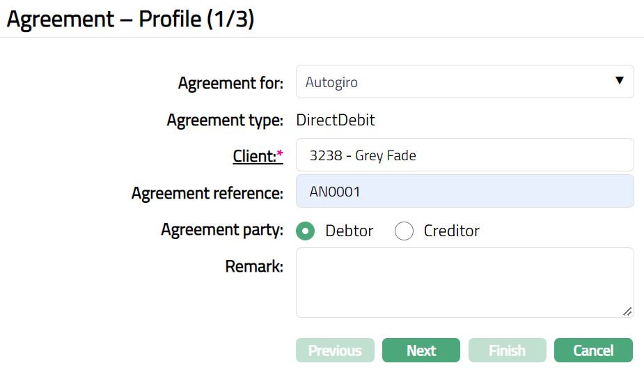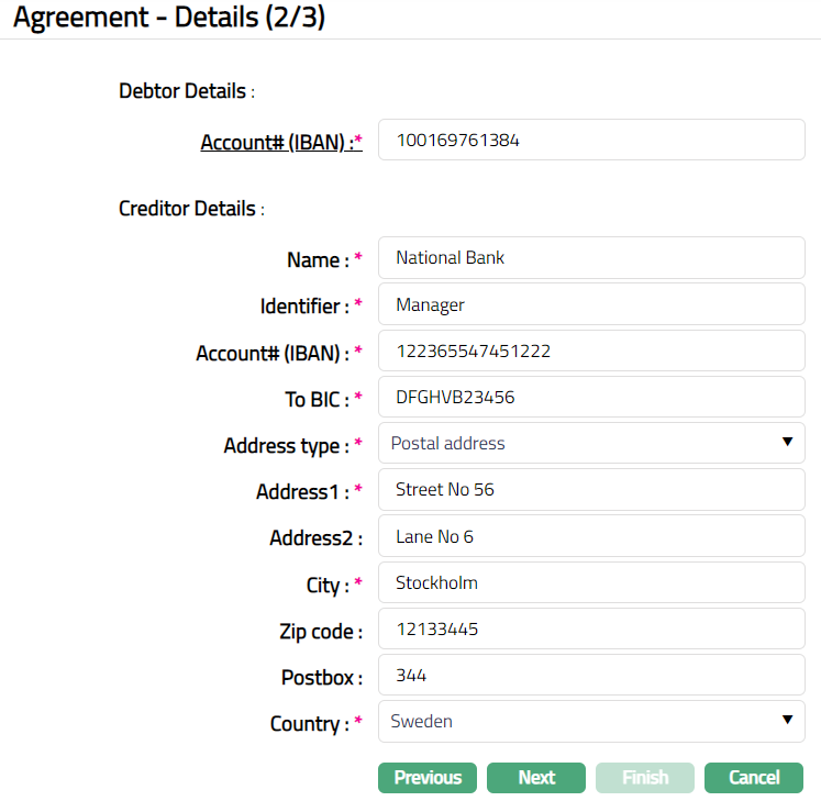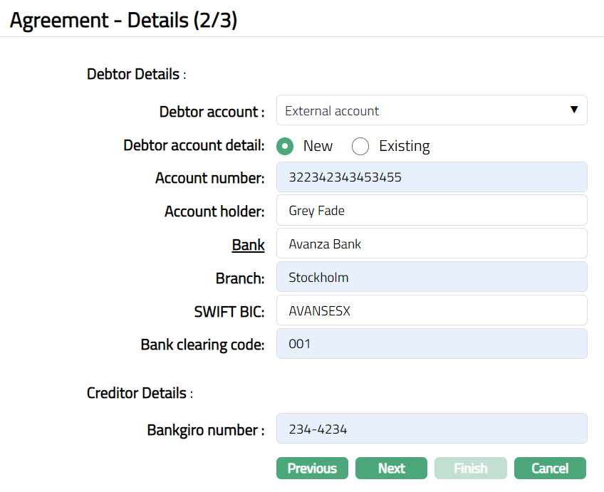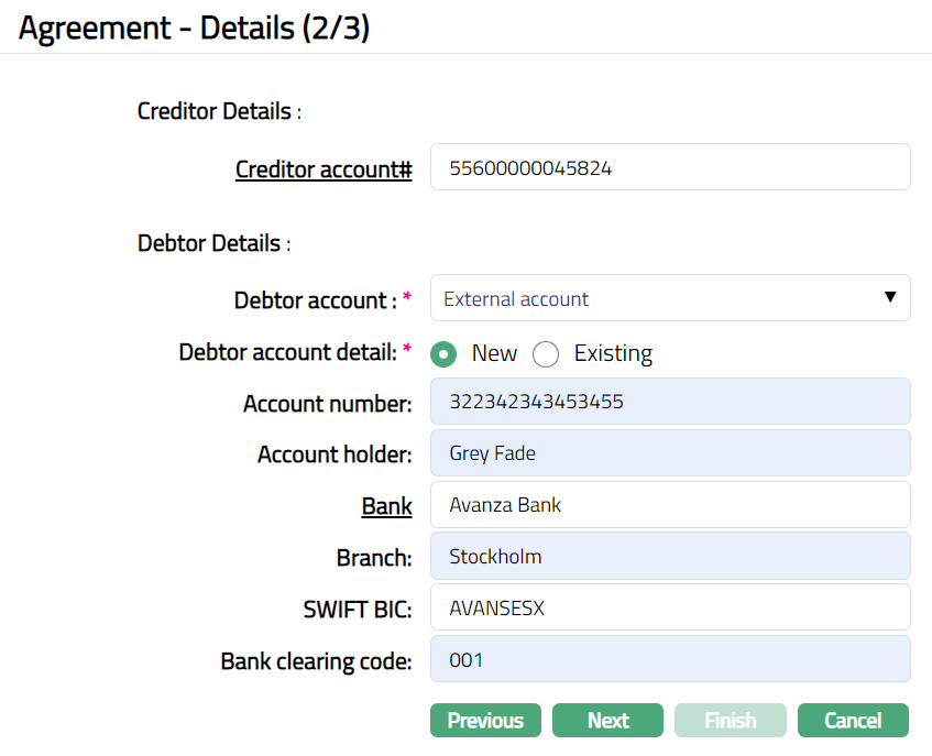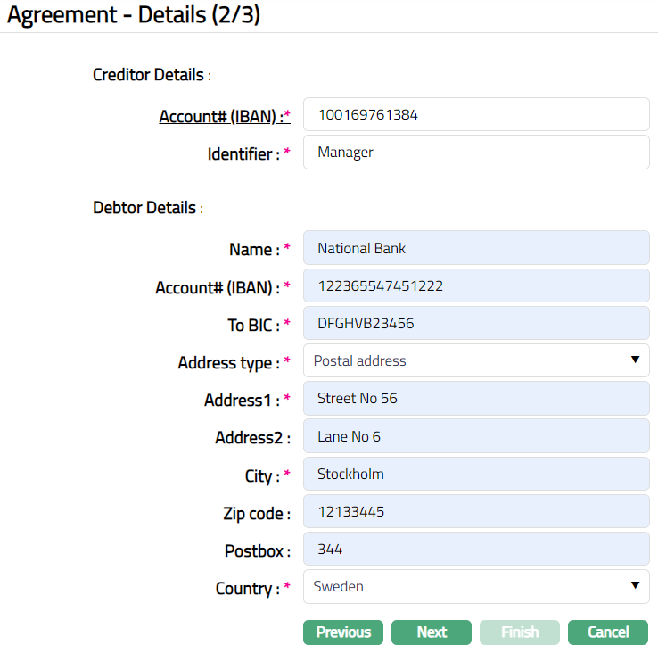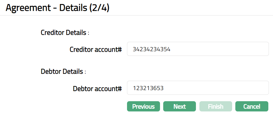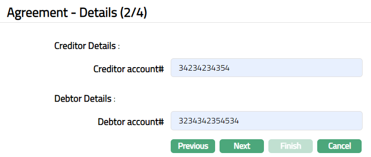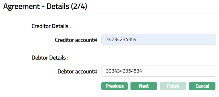 Based on the Agreement Party selection done here, you will have to fill in the Creditor and Debtor details in the Agreement -- Details (2/3) page.
