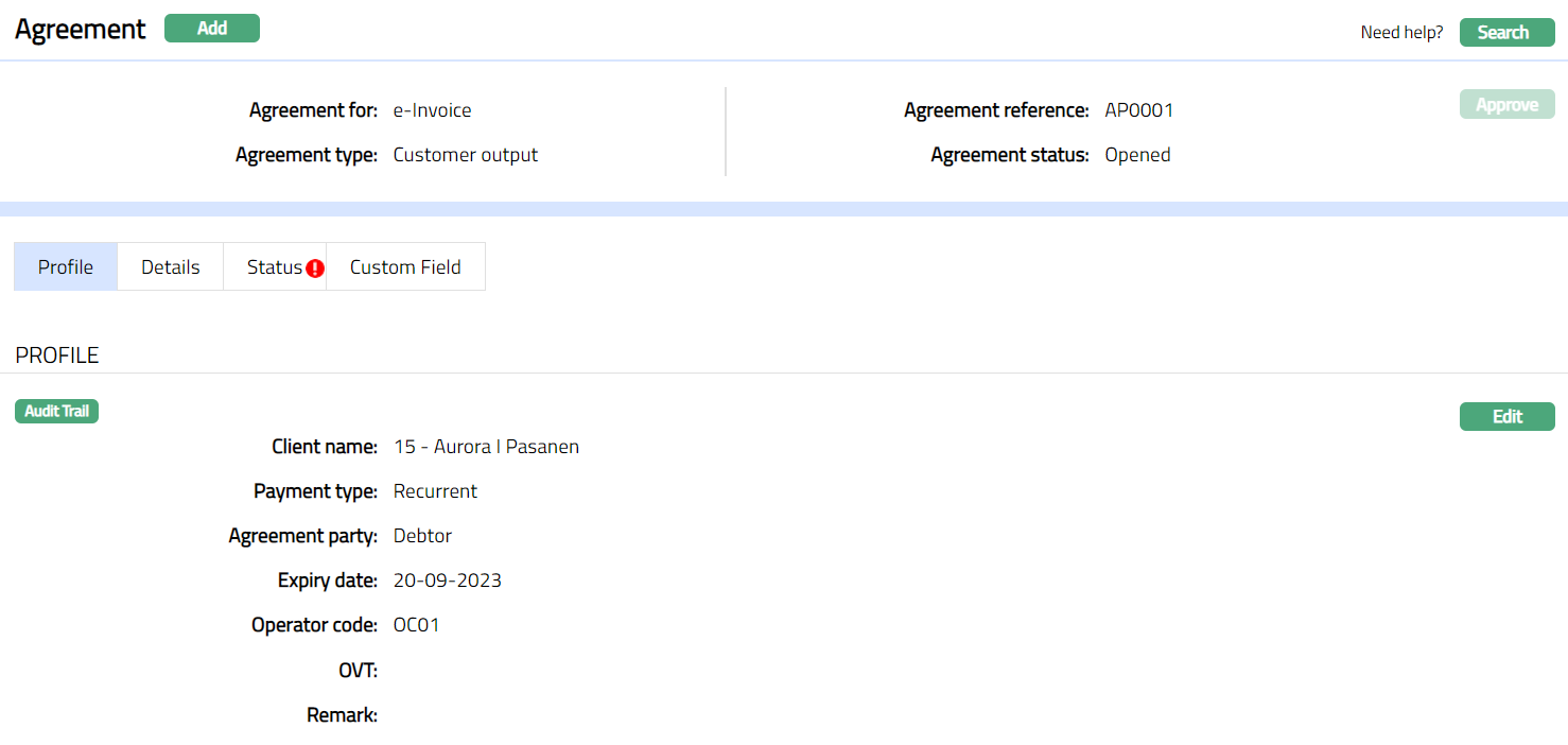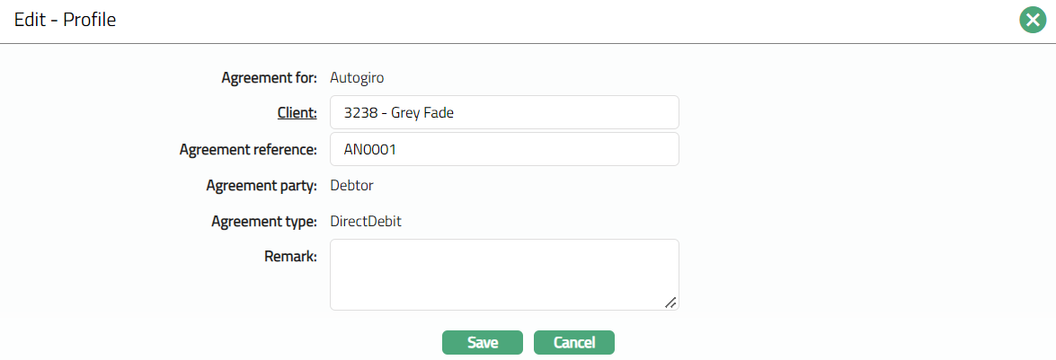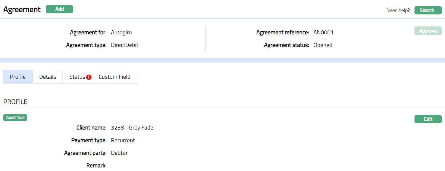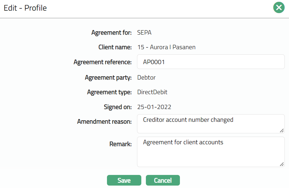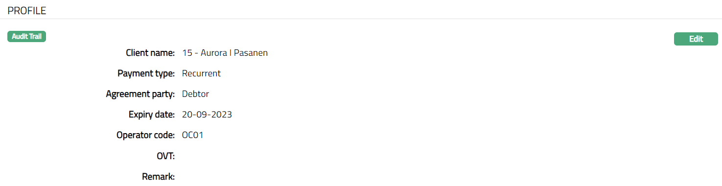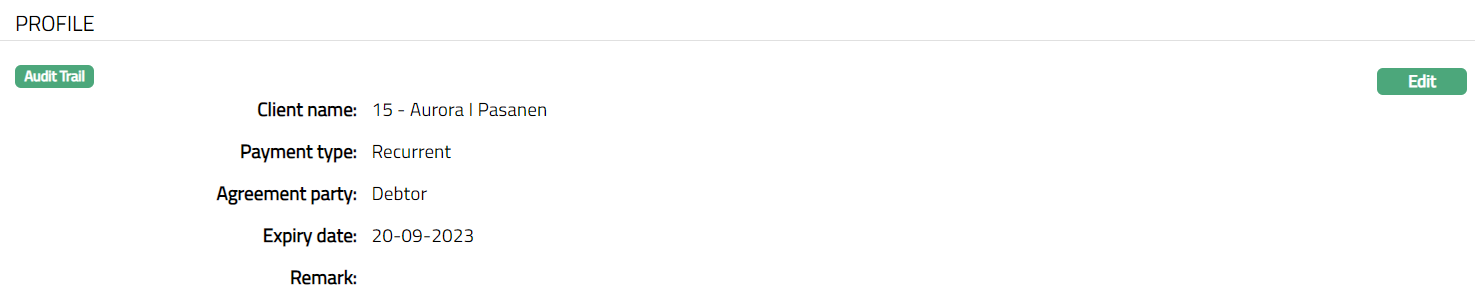 Profile tab, which is the default screen in the Agreement screen, shows the basic details of the Agreement. For details refer to Agreement for SEPA > Agreement -- Profile (1/3).