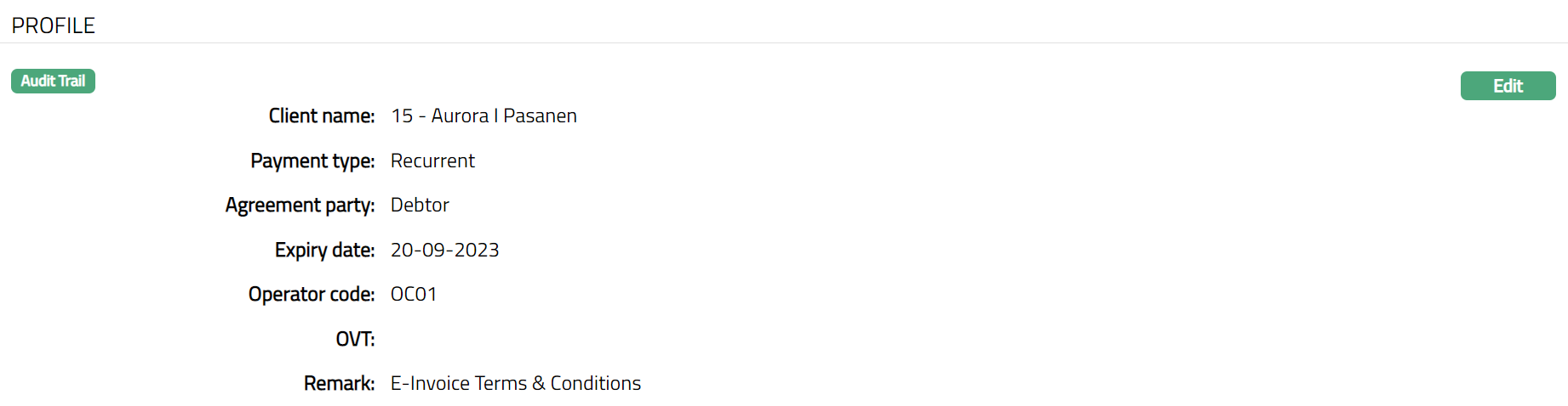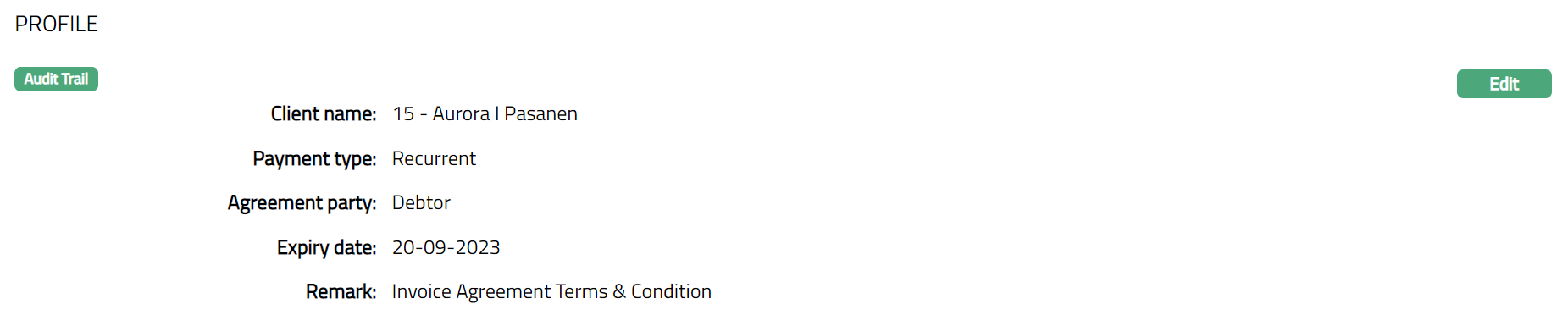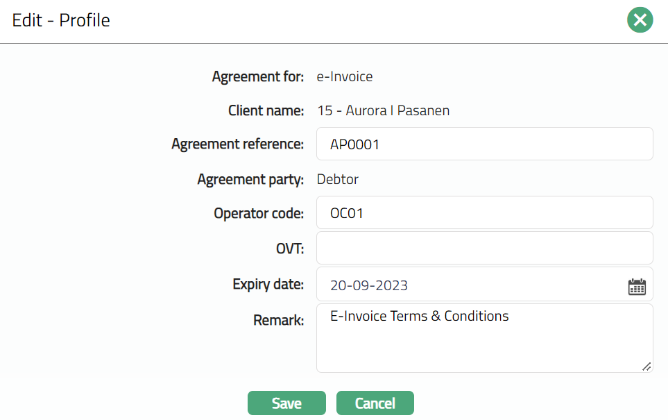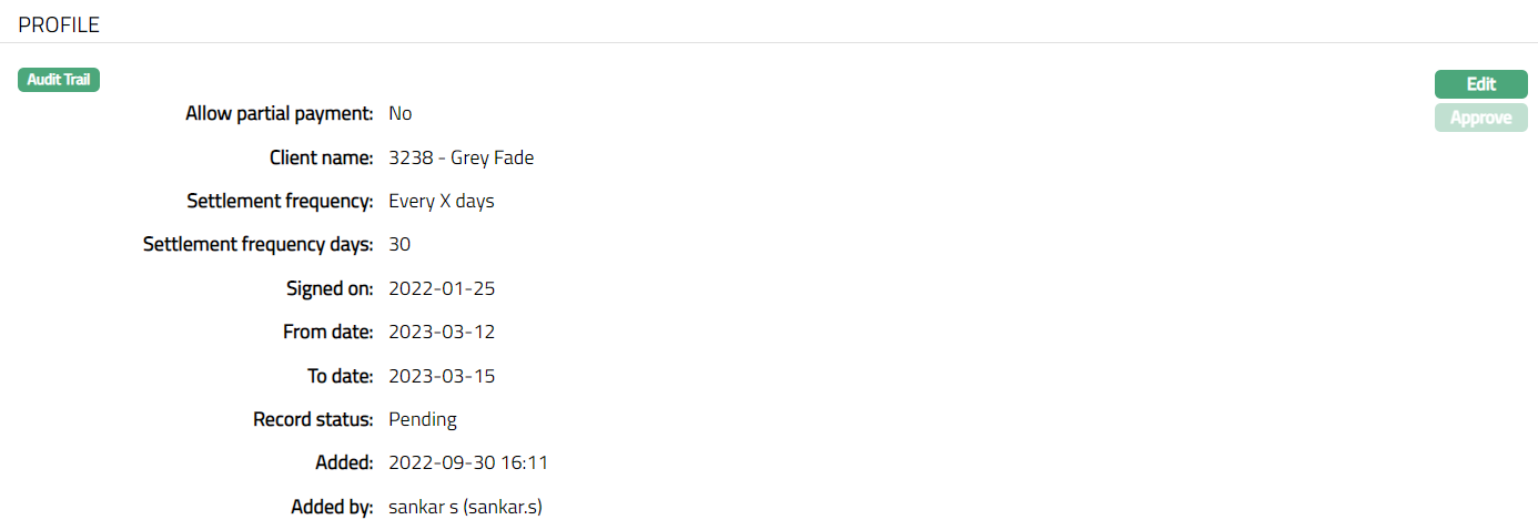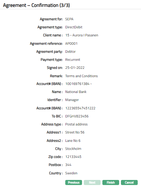 Profile tab, which is the default screen in the Agreement screen, shows the basic details of the Agreement. For details refer to Agreement for SEPA > Agreement -- Profile (1/3).
