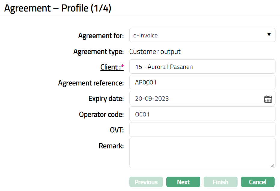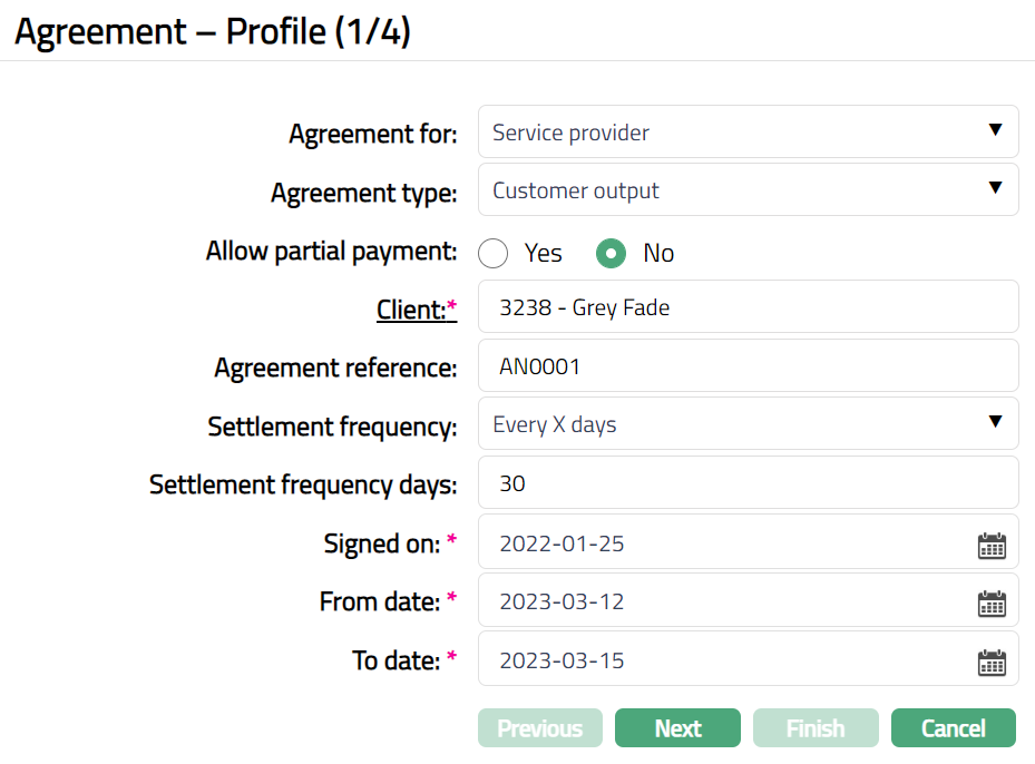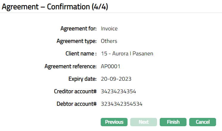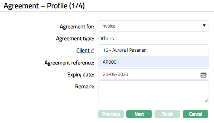 Click Finish. Agreement page appears with the added details, displaying the Profile tab by default.