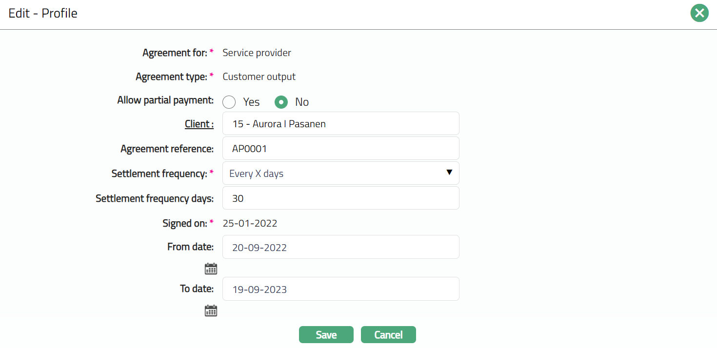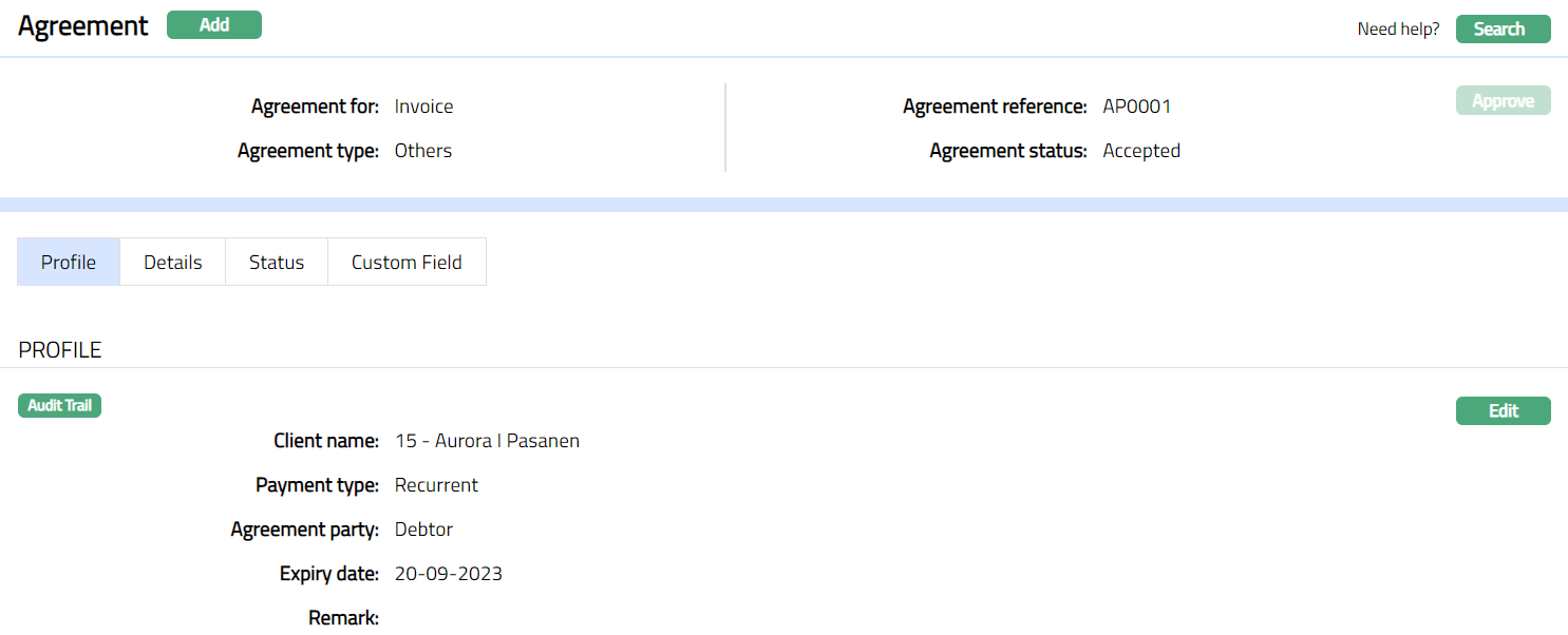 Profile tab, which is the default screen in the Agreement screen, shows the basic details of the Agreement. For details refer to Agreement -- Profile (1/4).