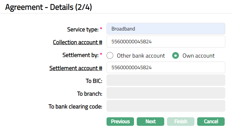Select Settlement by option. If Other bank account option is chosen, then the settlement is made through other bank account. If the Own account option is chosen, then the settlement is made through own account.