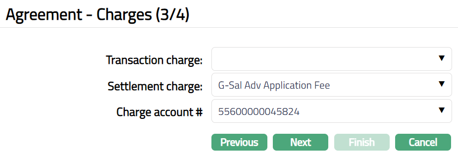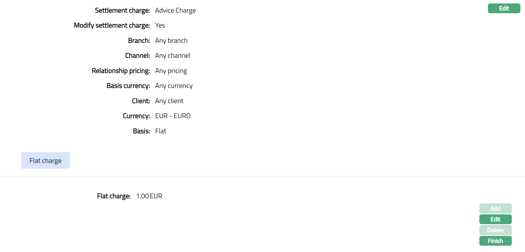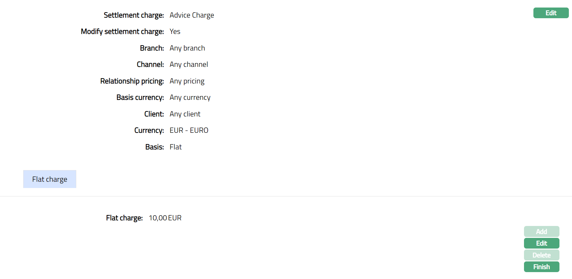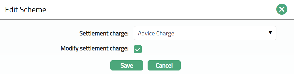 Select Settlement charge from the drop-down list of active charges maintained under Admin > Pricing > Charge scheme. The charge Type is Event and Basis is Flat or Banded.