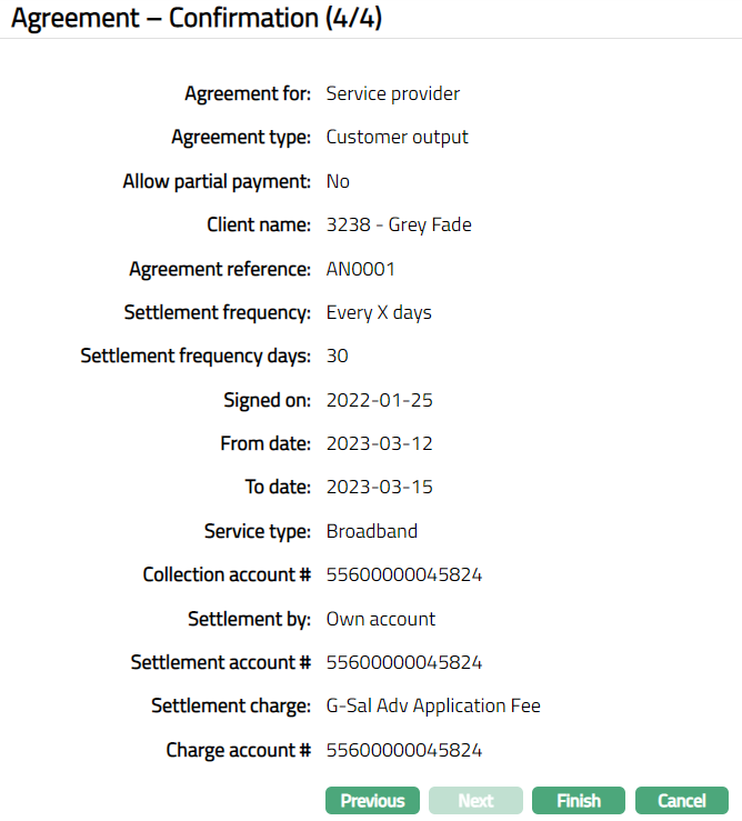 The service provider details entered in the Agreement for Service Provider > Agreement -- Details (2/4) are displayed under the Details tab.