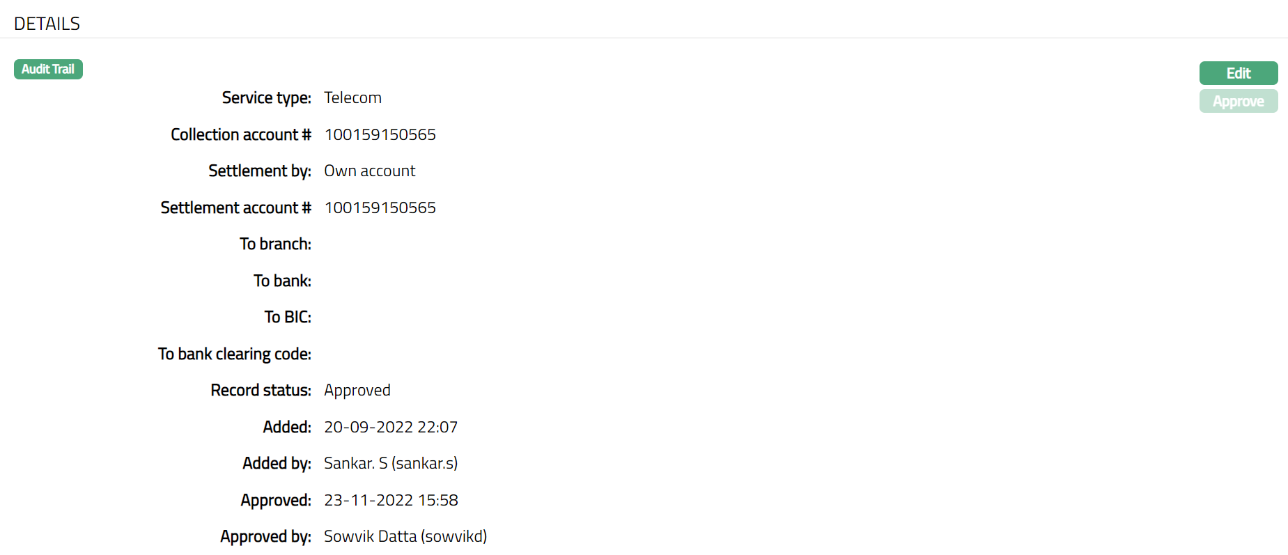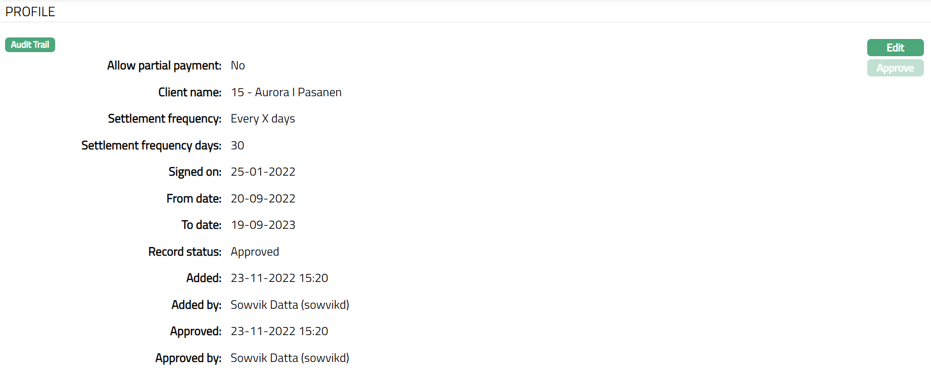 Approved by field displays name of the user who approved the record and is displayed only for approved records.