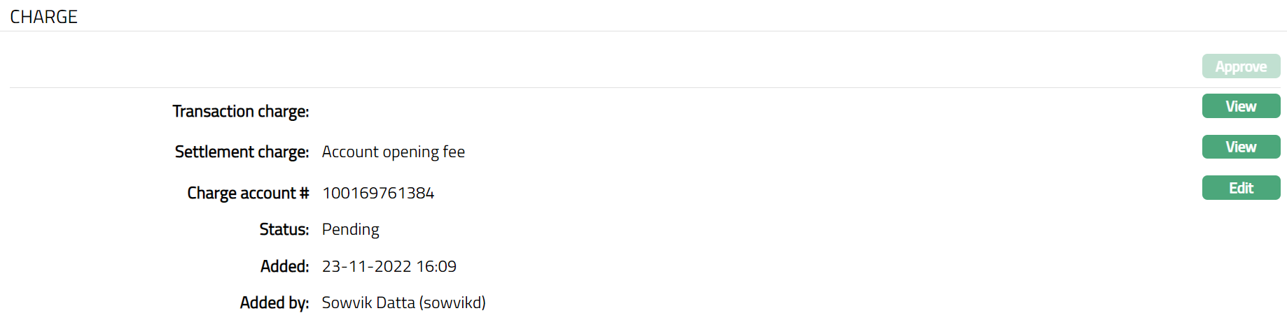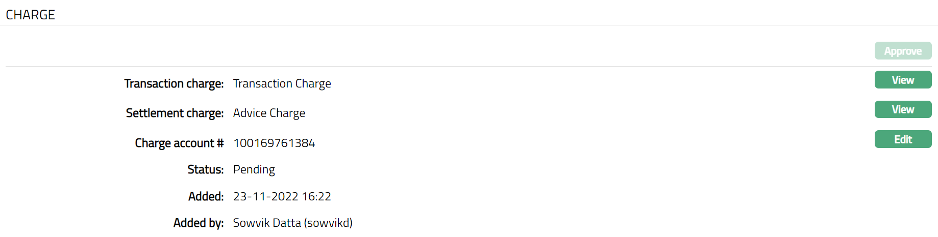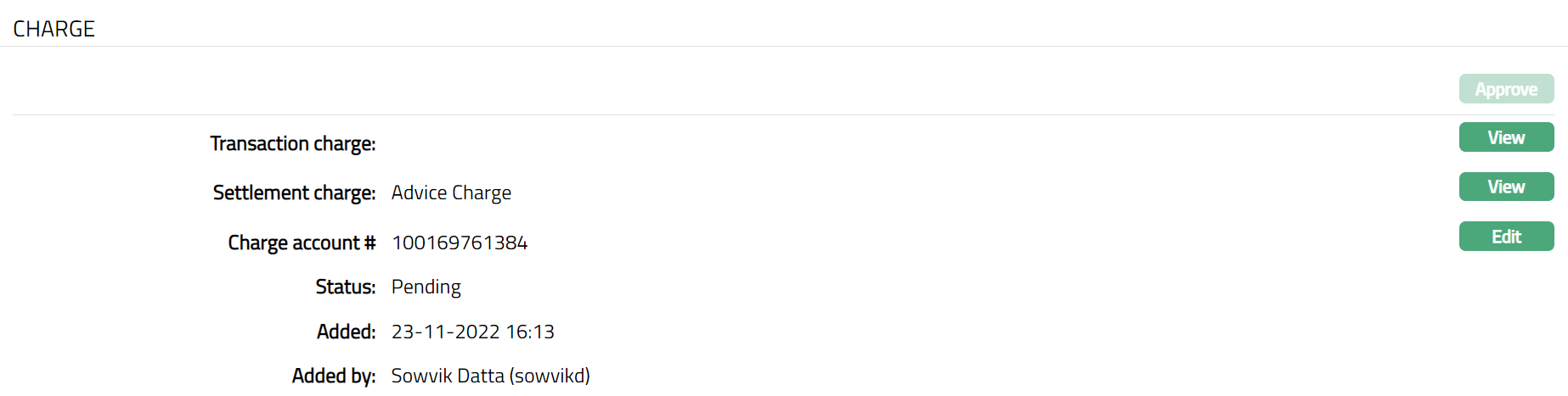 Select Transaction charge from the drop-down list of active charges maintained under Admin > Pricing > Charge scheme. The charge Type is Transaction and Basis is Flat or Banded. If a charge is Banded, then charge has arrived based on transaction amount of a transaction with the lower and upper bands maintained.