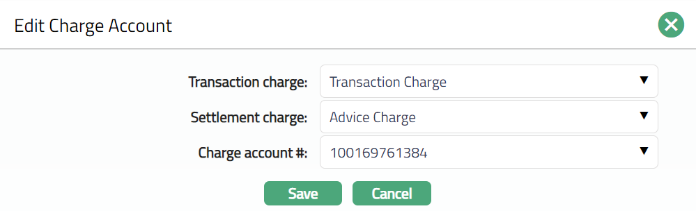Select Charge account # from the drop-down list of active current accounts maintained under Retail > Client Account > Maintain. Charge account# specifies the charge account number of the service provider.