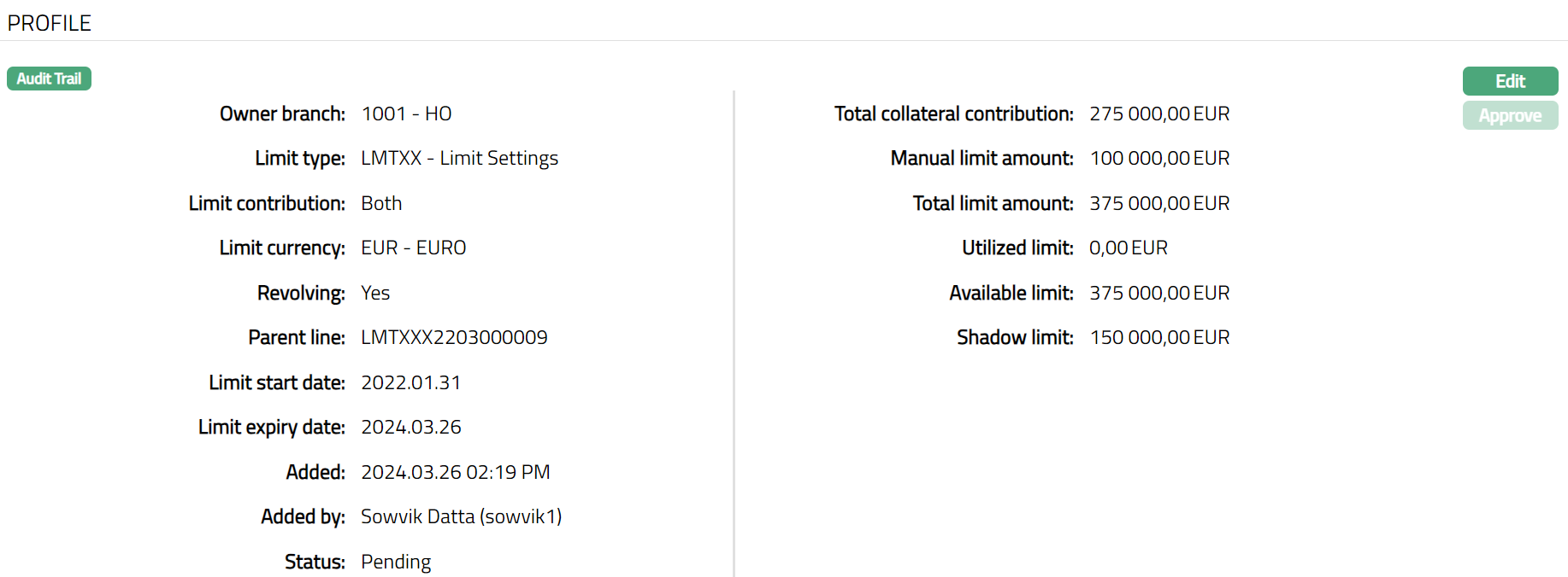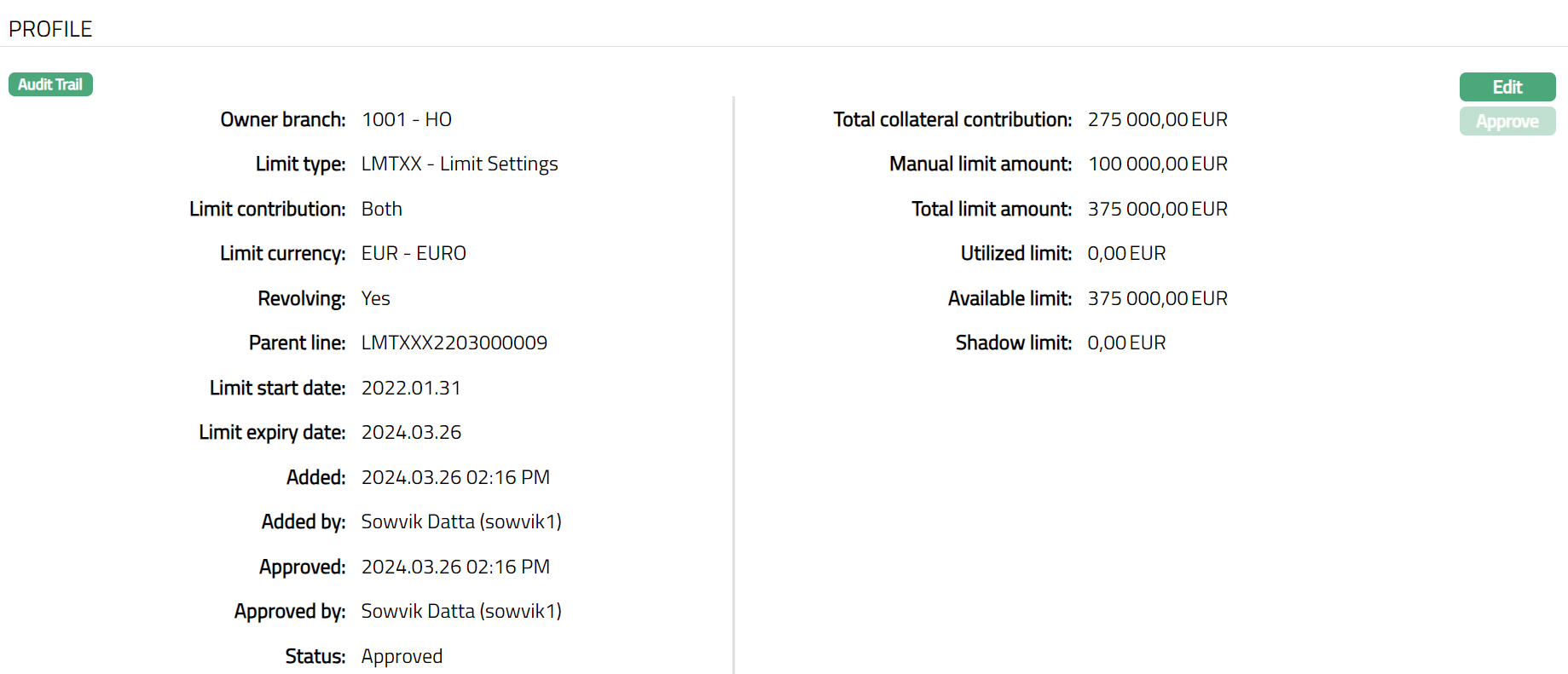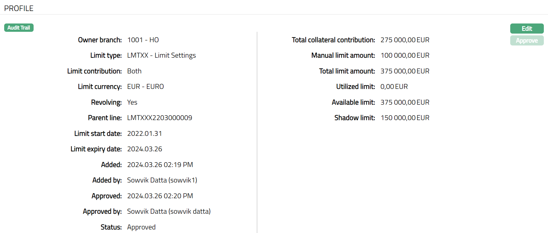 - Access Limit page and click Profile tab. It will display all the details defaulted from New Limit - Details (1/2) screen.