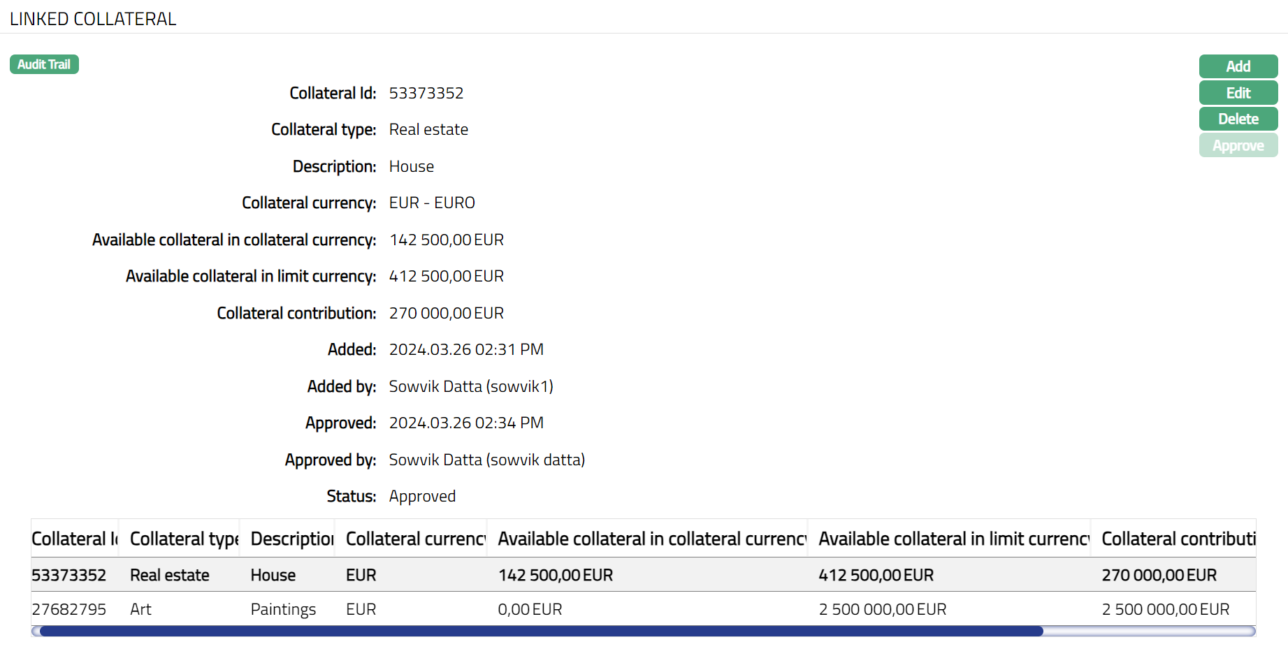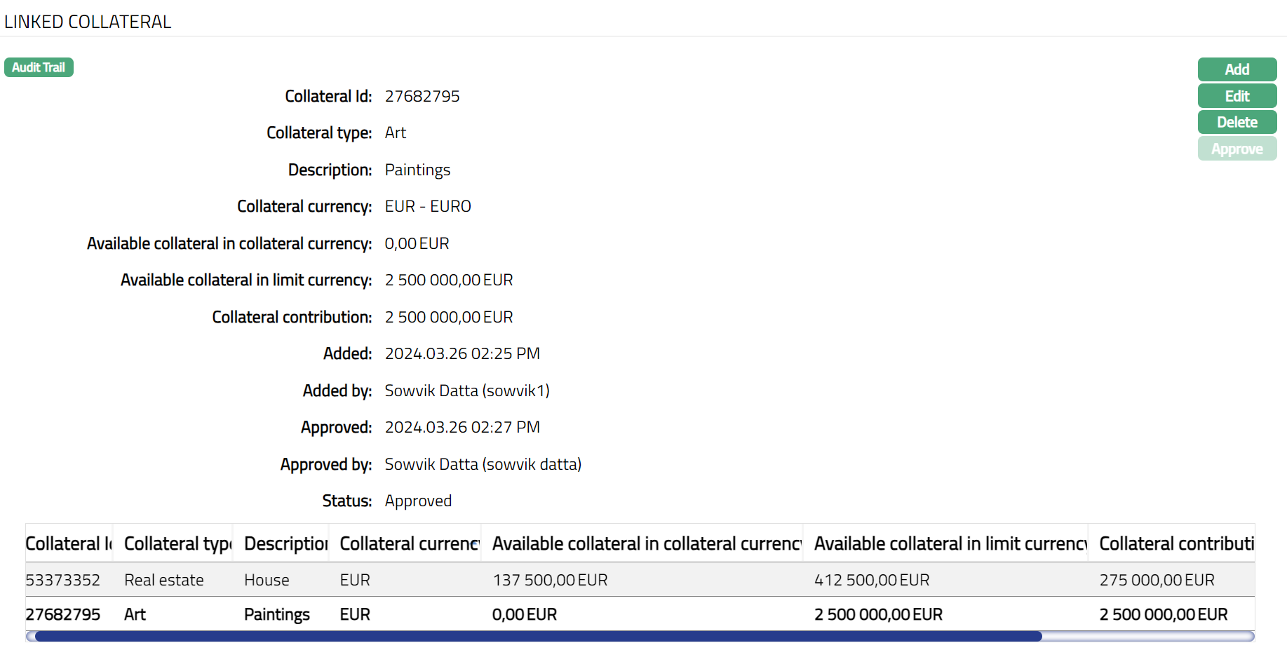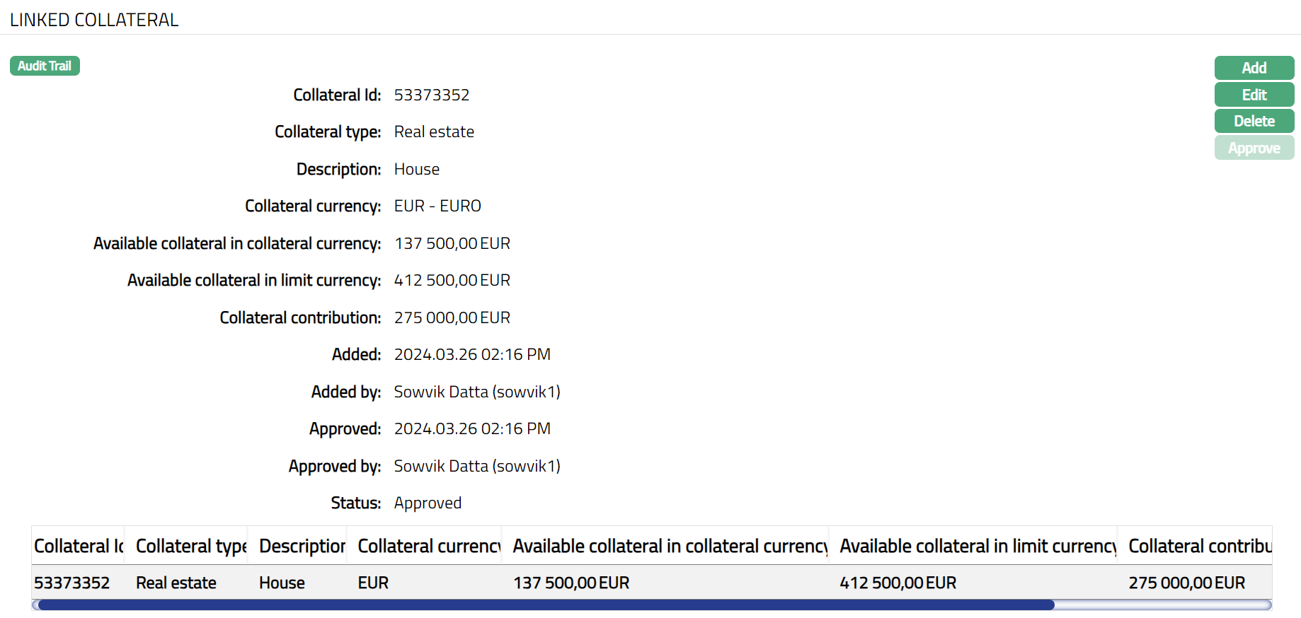 Access Limit page and click Linked collateral tab. Details of the Collateral(s) that was added to the Limit will be shown as per sample below: