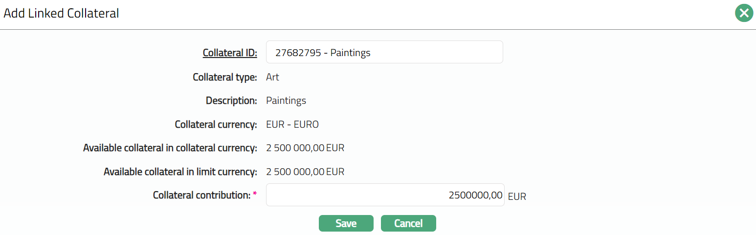 Once Collateral is selected above, the values for the Collateral type, Description, Collateral currency, Available collateral in collateral currency, Available collateral in limit currency and Collateral contribution fields gets auto populated. The values are derived from Collateral maintenance for the selected collateral.