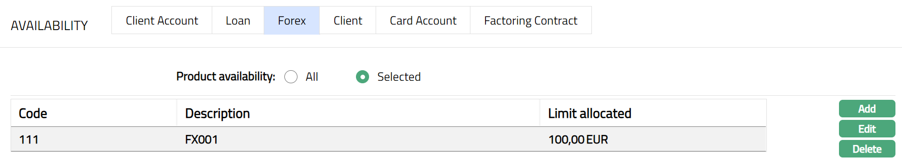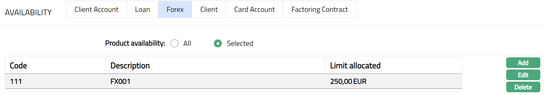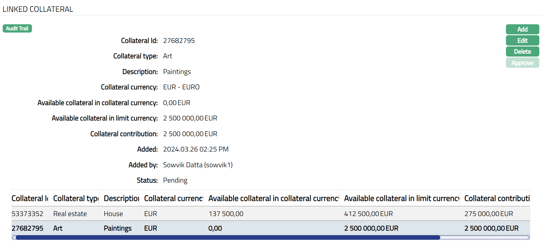 Using this tab, you can add or edit multiple collaterals; however, this is possible only if the Collateral has been made available to the Client under CRM > Collateral & Limits > Collaterals > Availability tab.