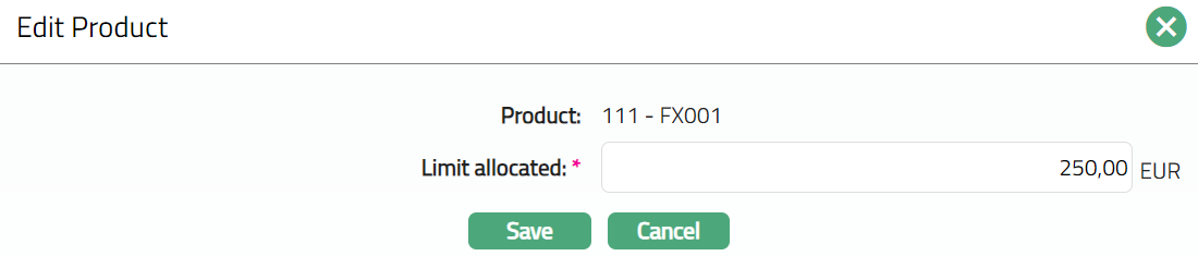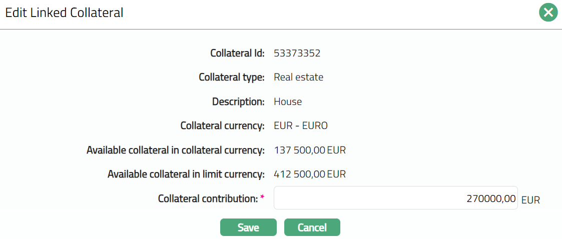 Input how much of the Available collateral in limit currency will contribute to this limit in the Collateral Contribution amount. This field will be enabled only if Limit contribution type is selected as Collateral or both; else, it will be disabled. Negative numbers will not be allowed. Entered Collateral contribution value should be less than the Available collateral in limited currency.
